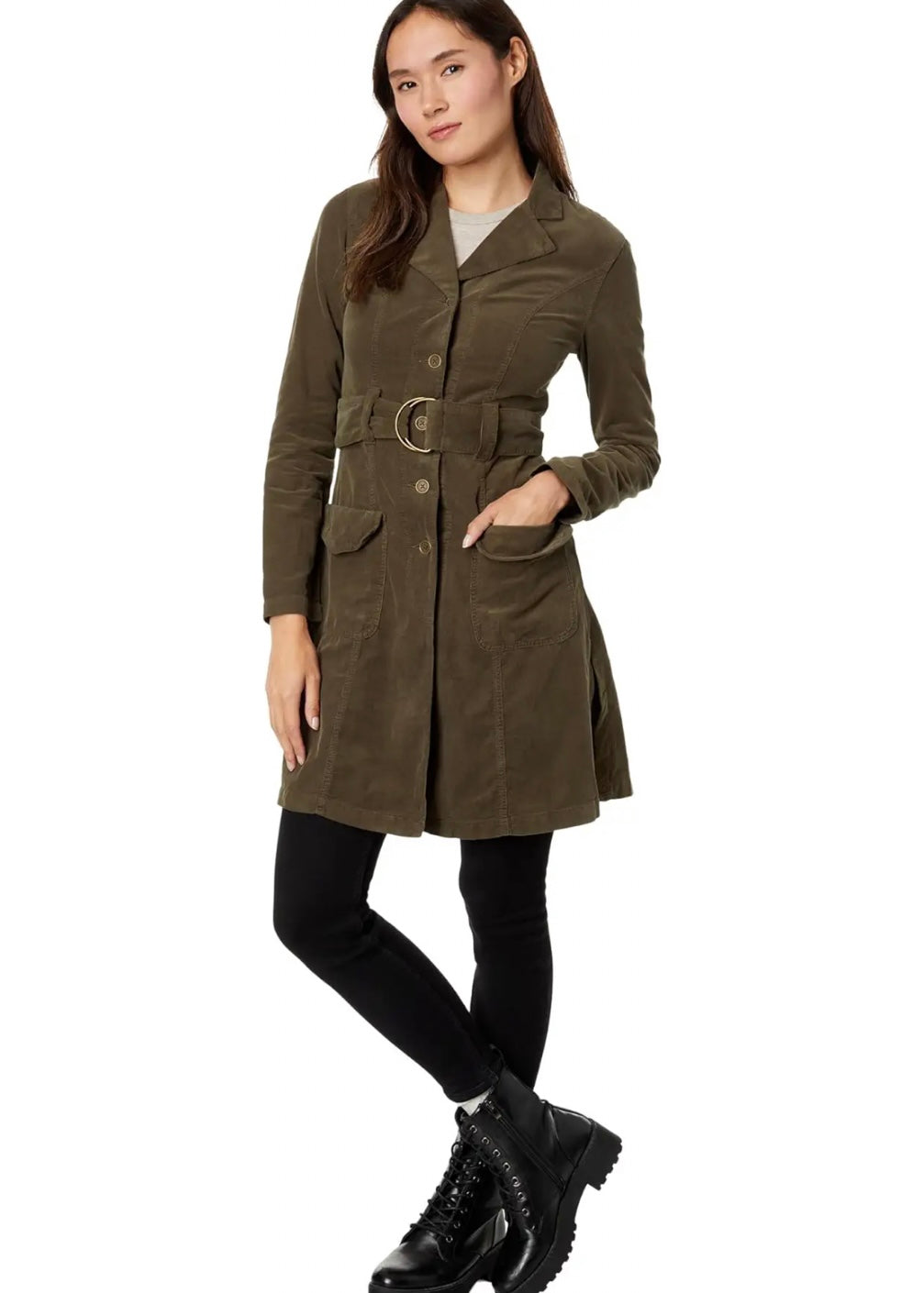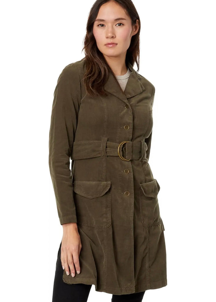 We dug through the archives to revive an old favorite with this one! A classic belted corduroy trench with 2 flapped patch pockets and a button-up front closure.