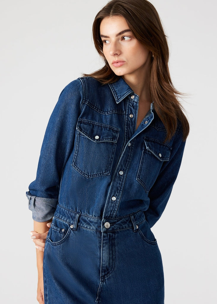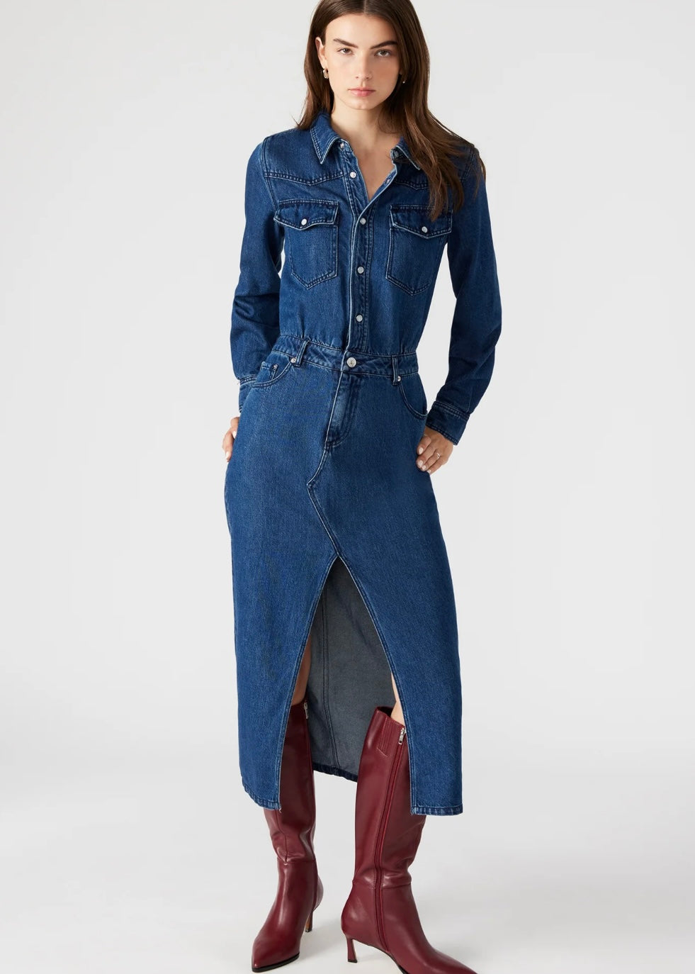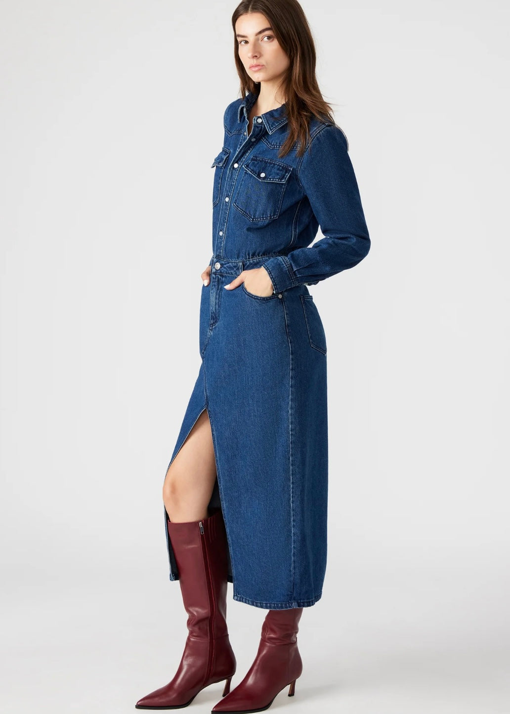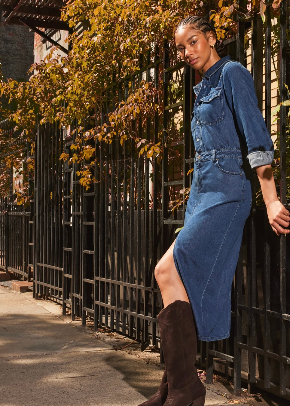 Elevate your wardrobe with this fun denim dress. Crafted with a denim long-sleeve bodice, button-down maxi dress, and shank to zip front skirt, this dress exudes effortless style. The center front slit adds a touch of femininity, while the skirt pockets provide both convenience and practicality. Perfect for any occasion, this dress will be a staple in your closet.