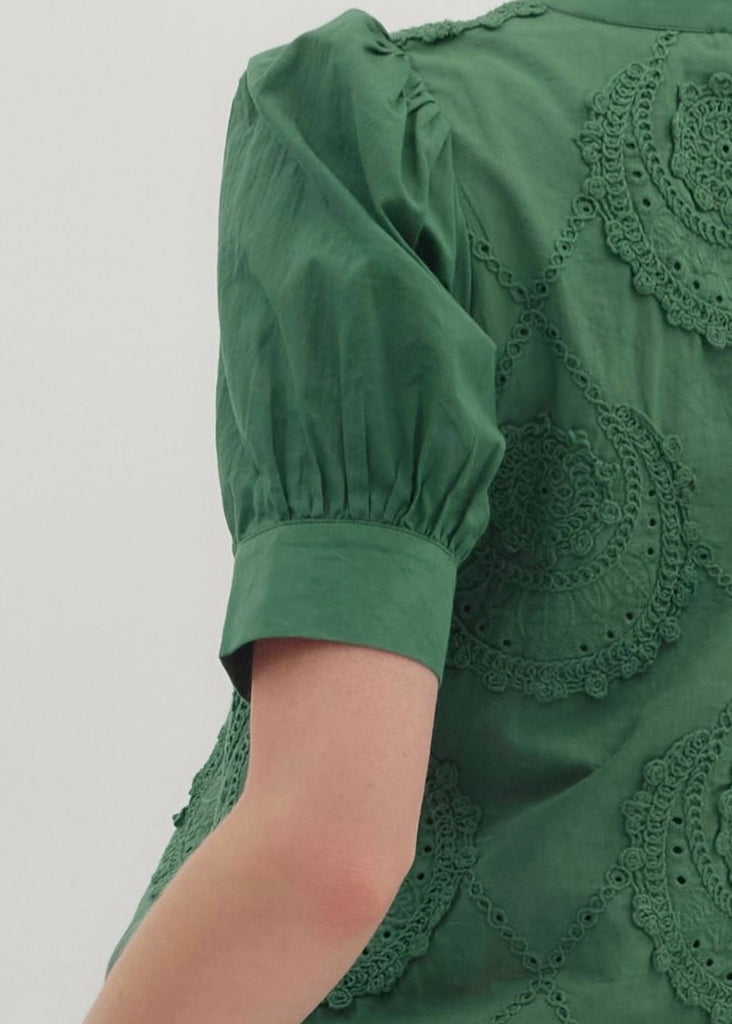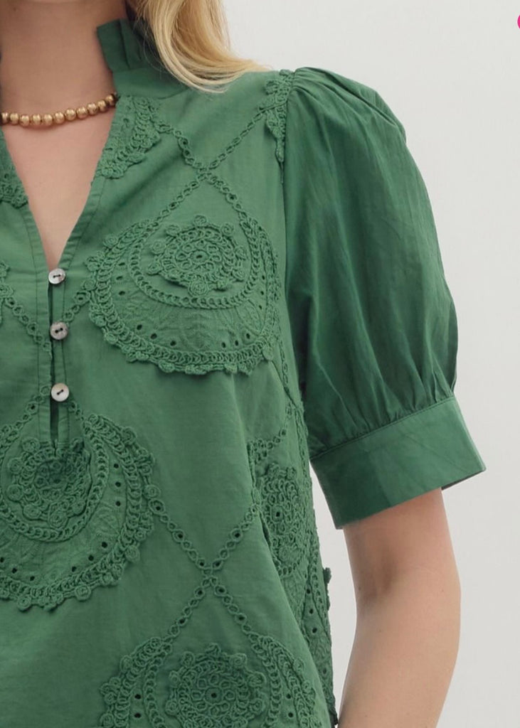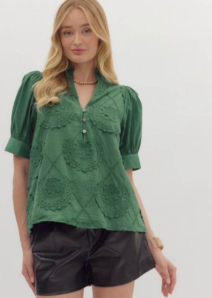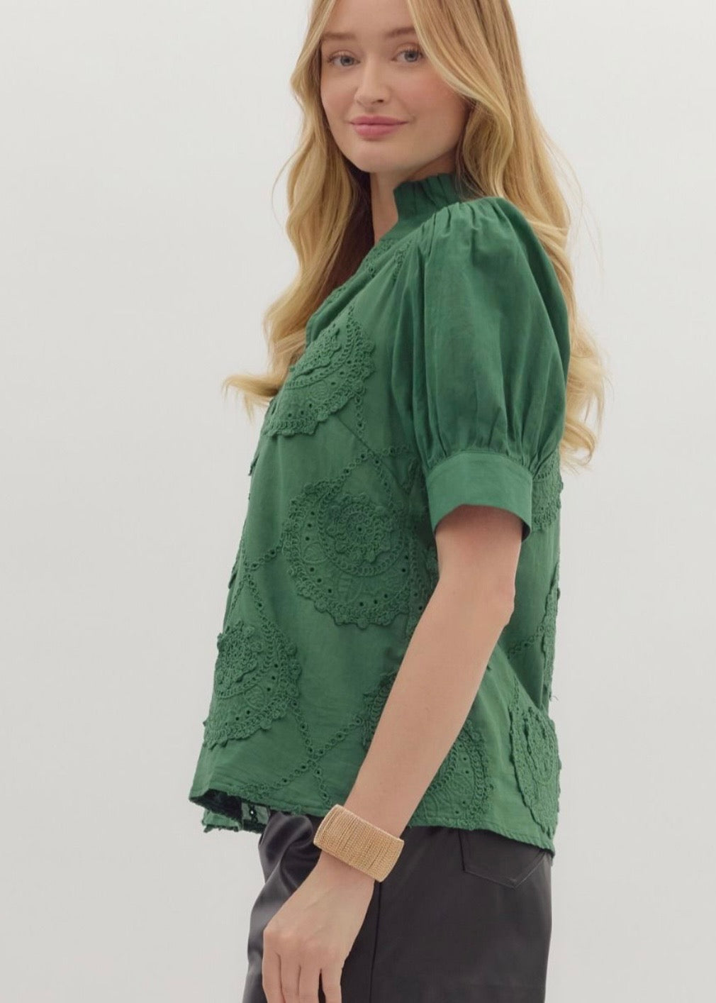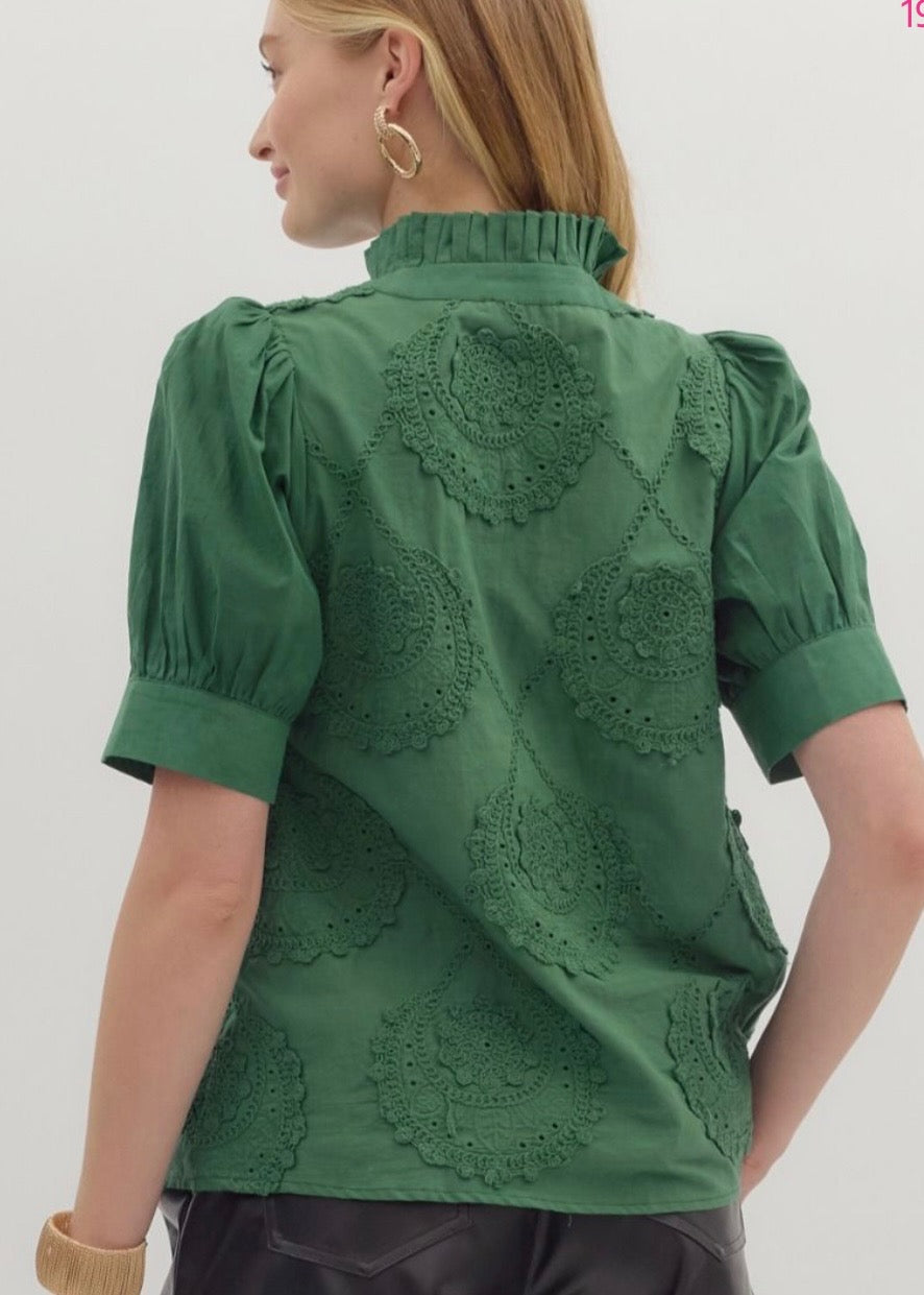 The Emerald Elegance Blouse is a playful and elegant piece that will make you stand out. Featuring intricate embroidery and an applique accent, this blouse has a button front closure and band collar, creating a uniquely stylish look. The lightweight and non-sheer fabric adds to its charm.