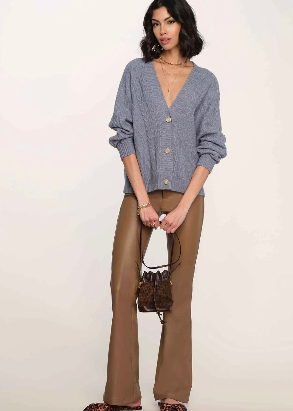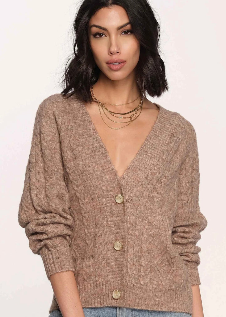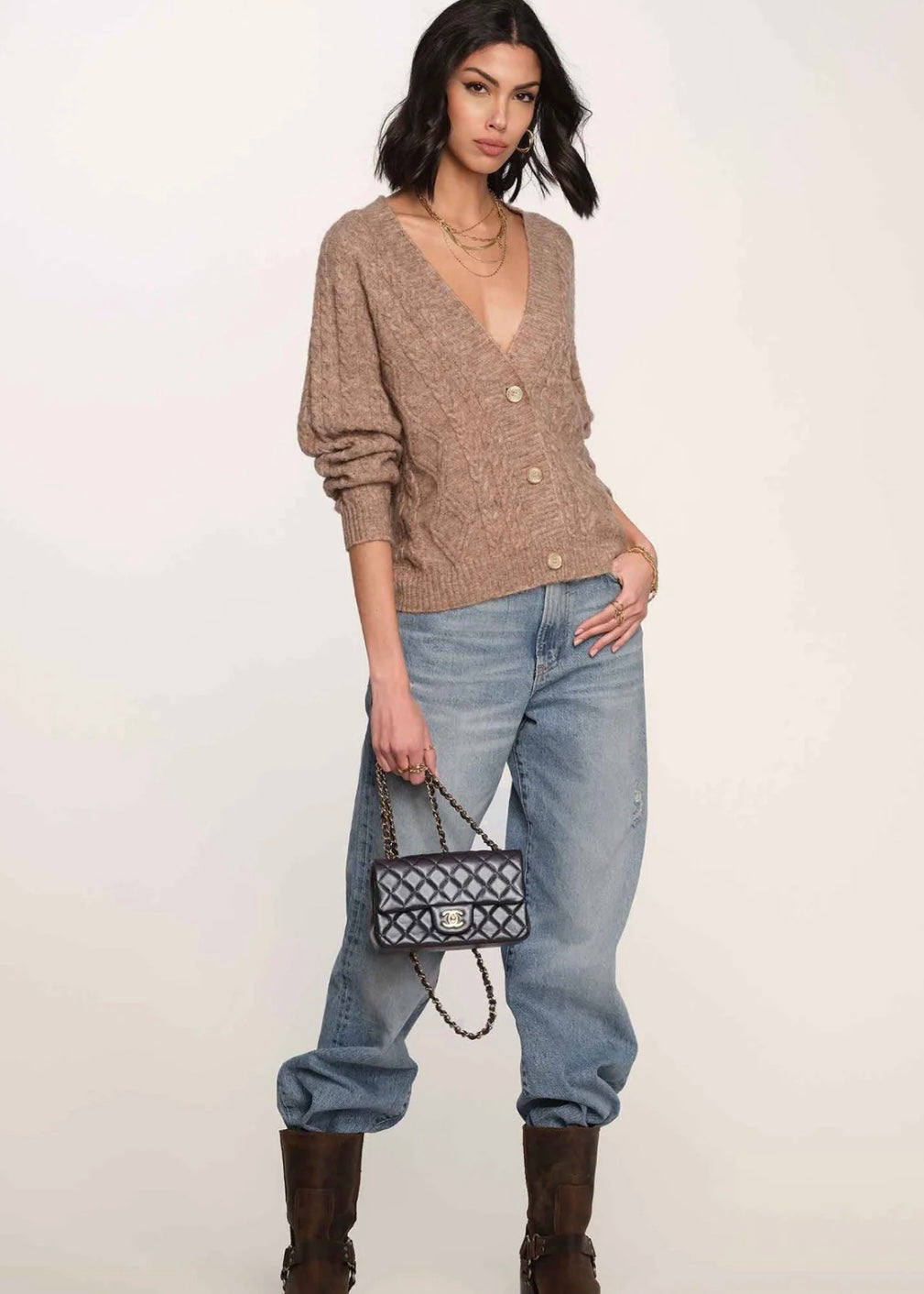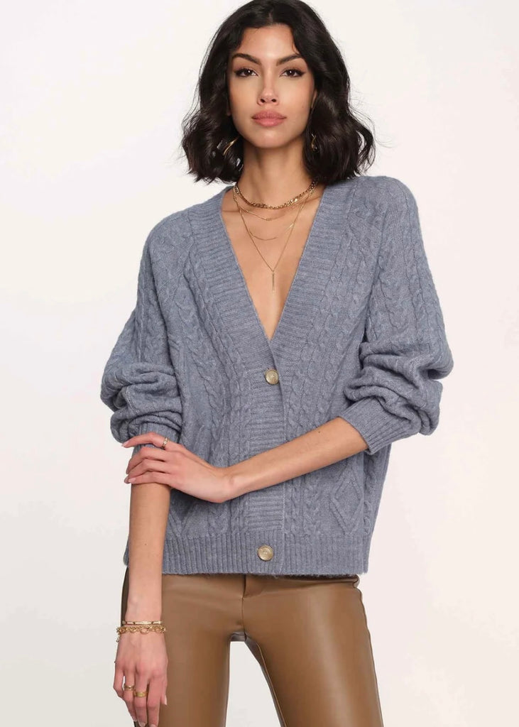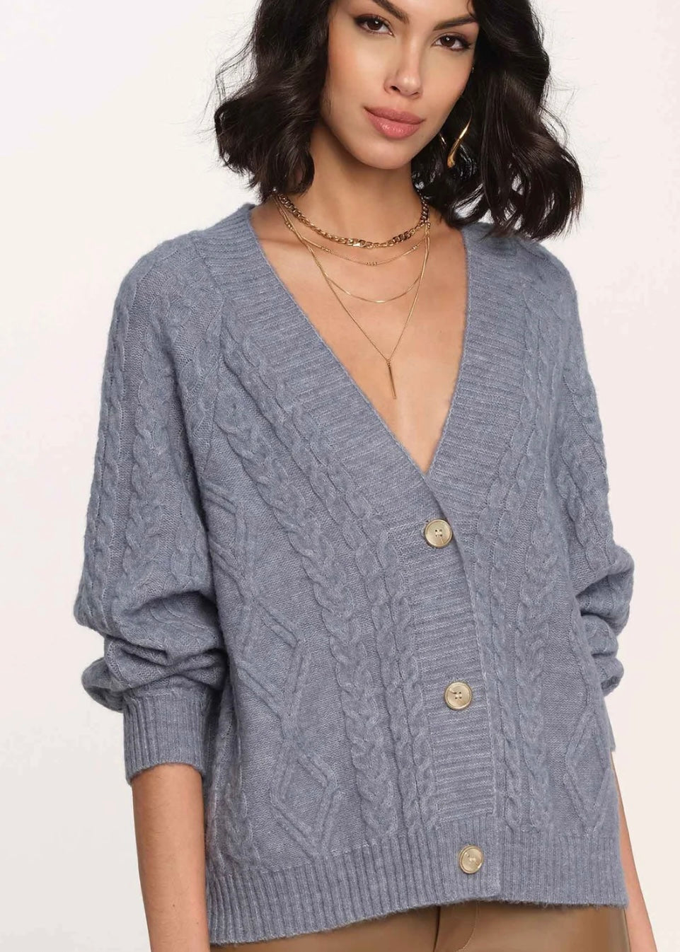 The Evie Cardi is a transitional classic. It is knit from a soft, melange yarn with mixed cable sttich details It fetures a deep v-neck and slightly oversized fit. Wear alone with denim or over a plain white tee.