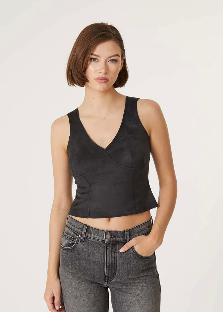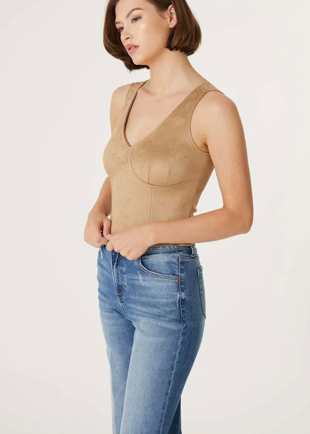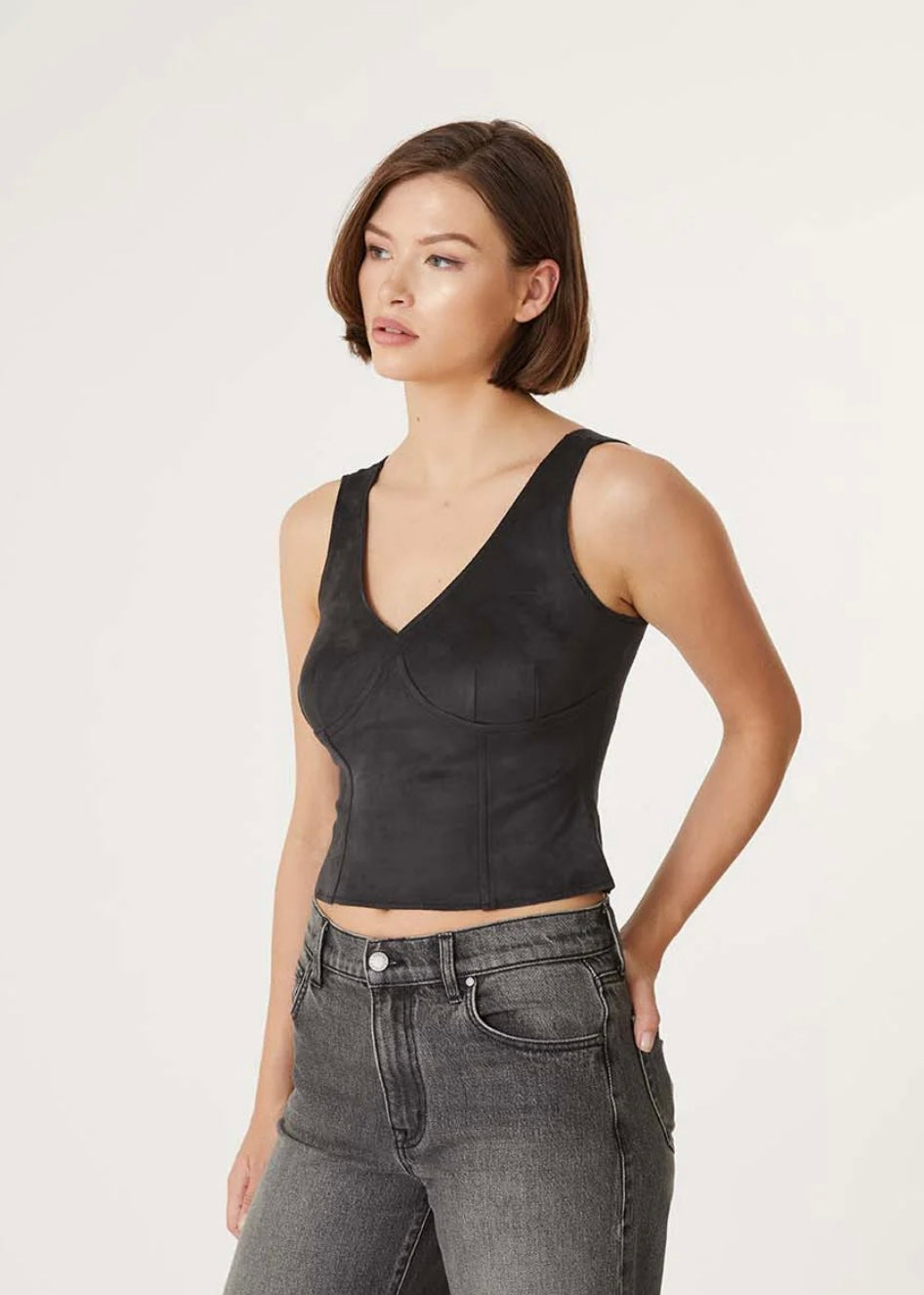 Crafted in soft stretch faux suede, this tank top features a flattering V-neck and seaming details that take inspiration from the corset trend. It hugs your silhouette in all the right places, making it the perfect piece for layering your Fall look.