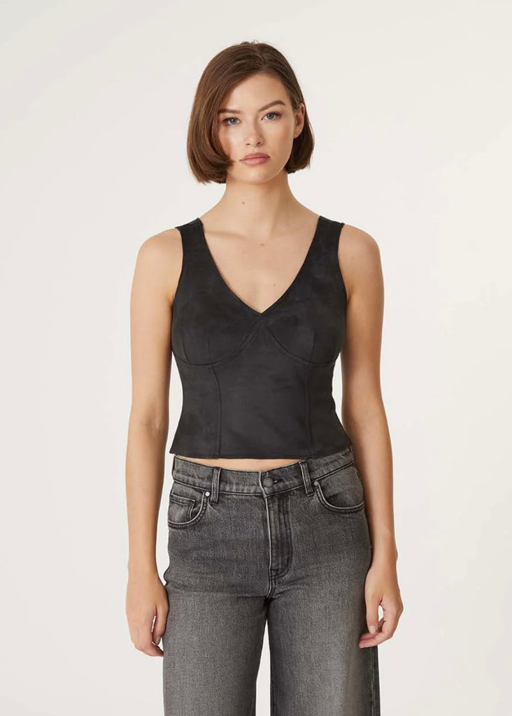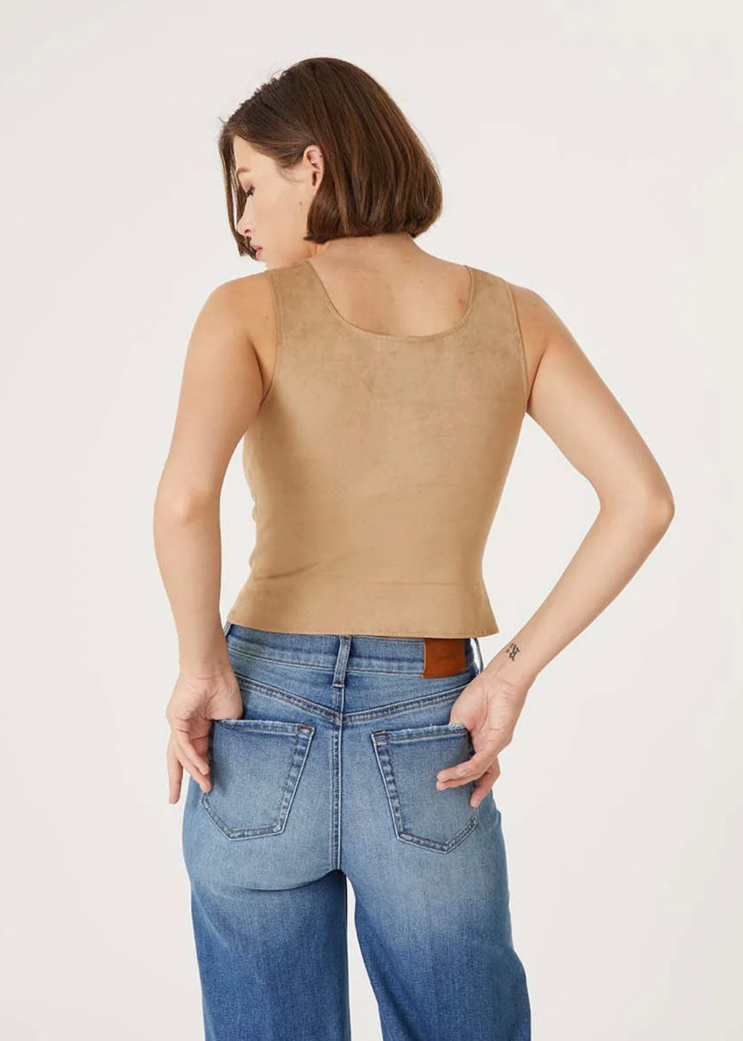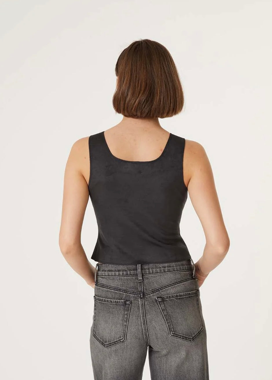 Crafted in soft stretch faux suede, this tank top features a flattering V-neck and seaming details that take inspiration from the corset trend. It hugs your silhouette in all the right places, making it the perfect piece for layering your Fall look.