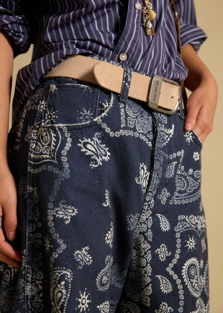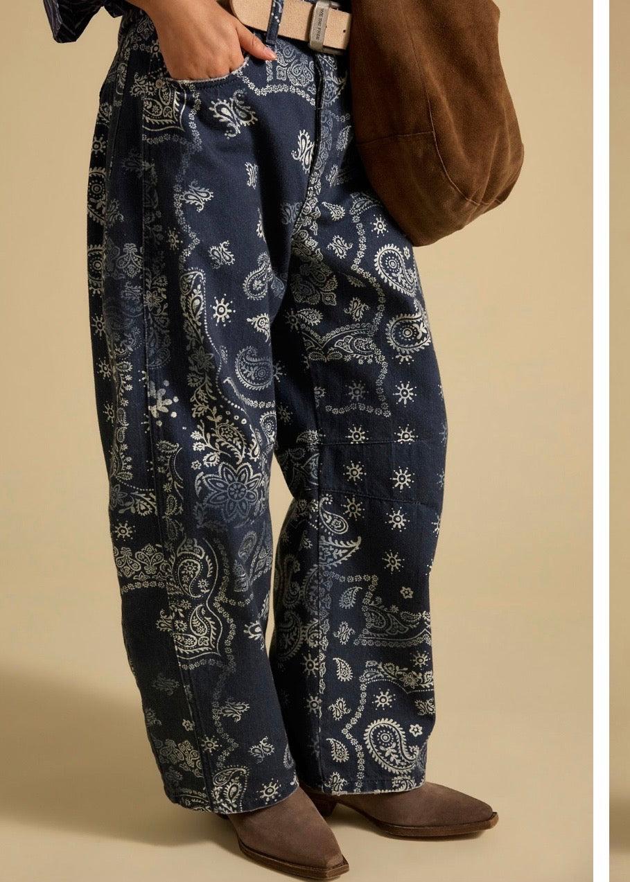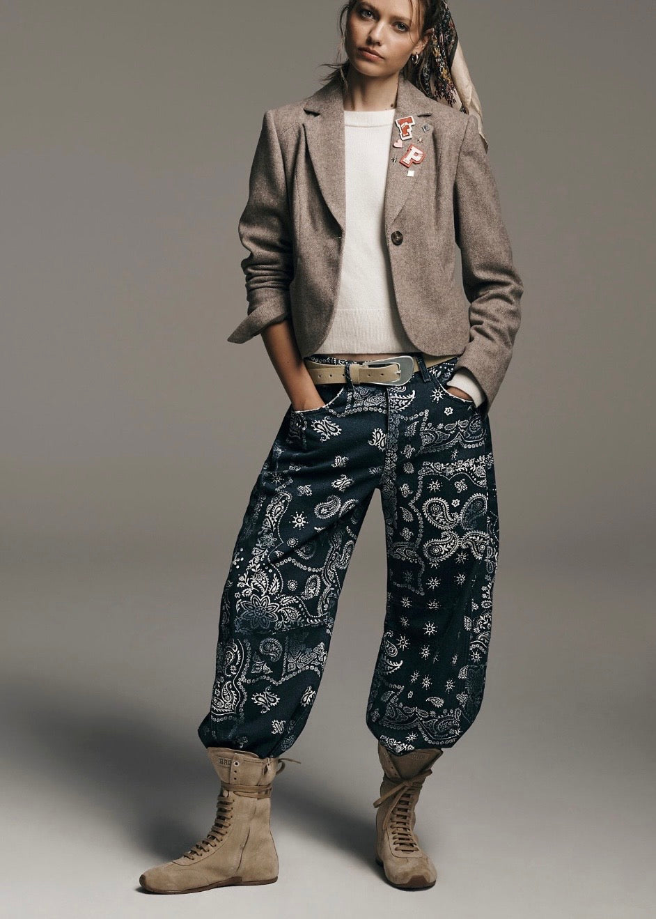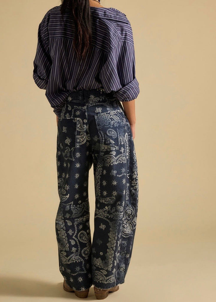 Our most-loved barrel jeans from Free People, now featured in a playful printed fabrication.