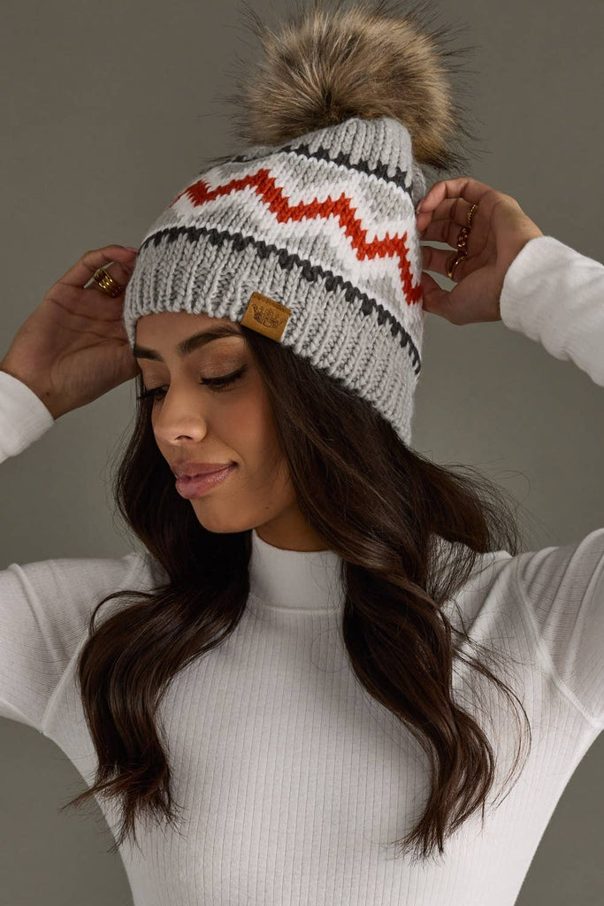 Our Summit Stripes Pom Beanie hat rocks a gray, red, white & charcoal pattern