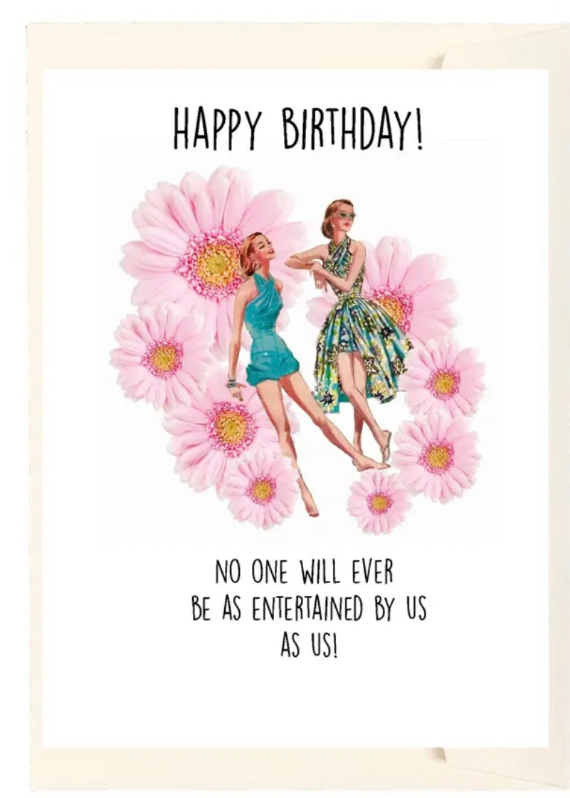 Happy Birthday! No one will ever be as entertained by us as us! Card is backordered and will ship as soon as it is back in stock.