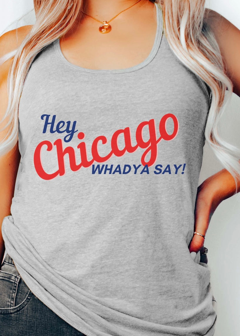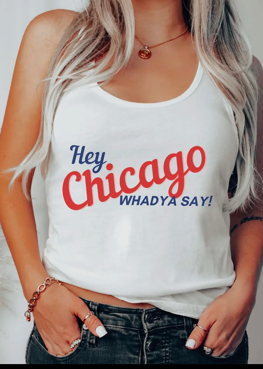 Let your Cubs pride shine in our "Hey Chicago Whadya Say" Graphic Tank! ⚾ Whether you’re chanting along at Wrigley, catching the game at home, or just repping the Northside in style, this tank is a true fan favorite. Made from super-soft, breathable fabric with a flattering, relaxed fit, it’s perfect for those warm summer days, game nights, or casual weekends with the crew.