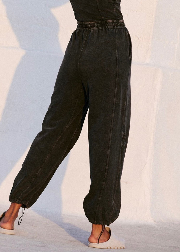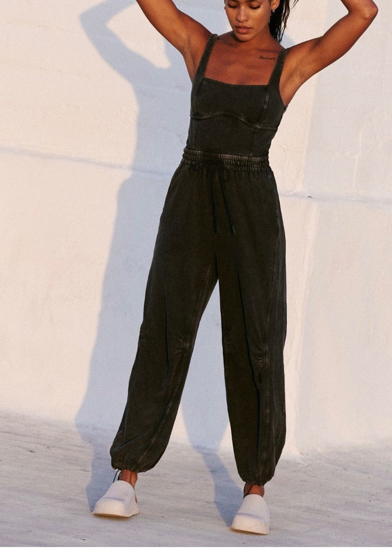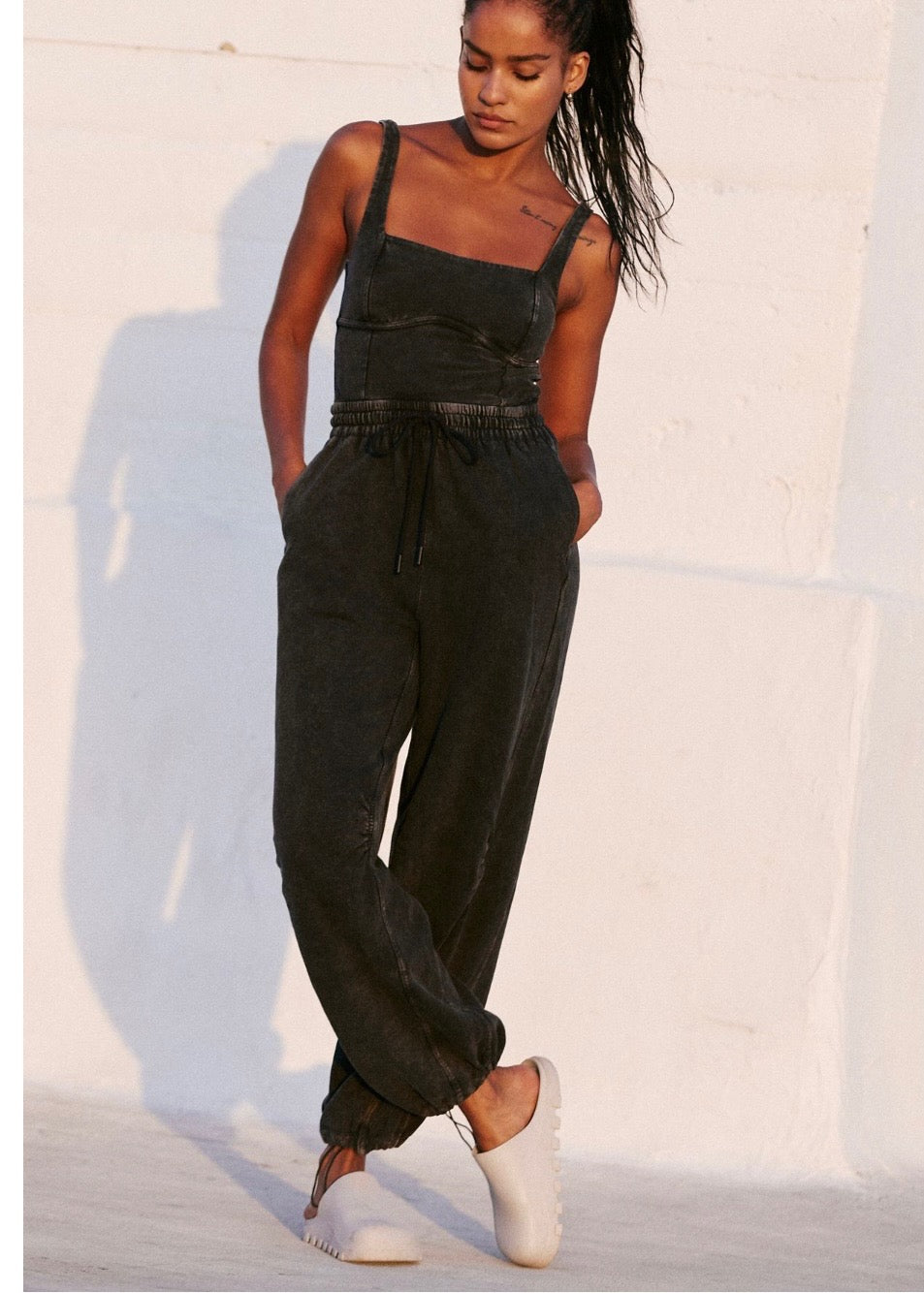 Soft fabrication with stretchy feel; square neckline and detailed bust seaming; large side pockets; ruching around the knee; elastic ankle cuffs; straight-leg bottom; adjustable drawstring waistband.