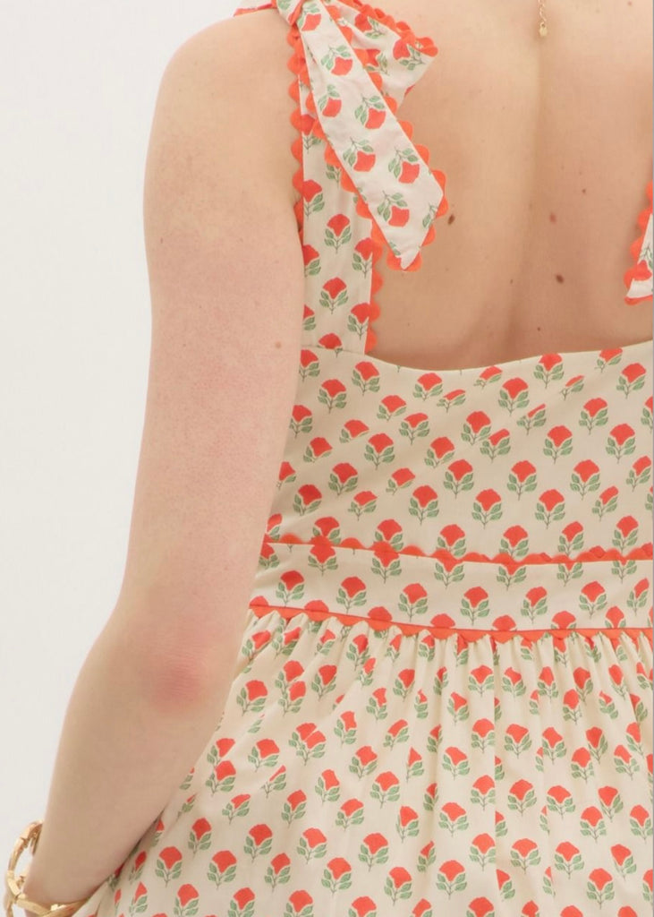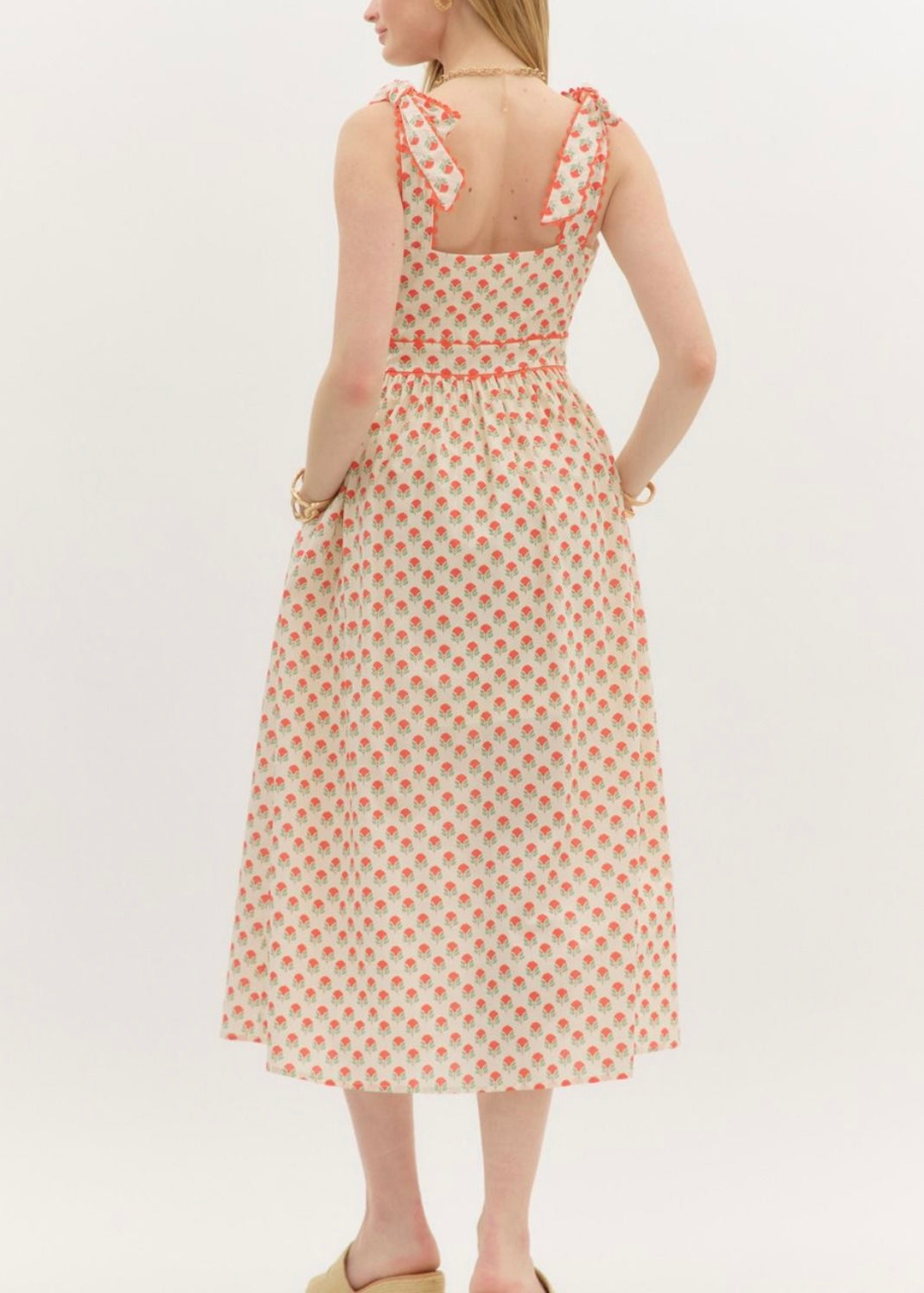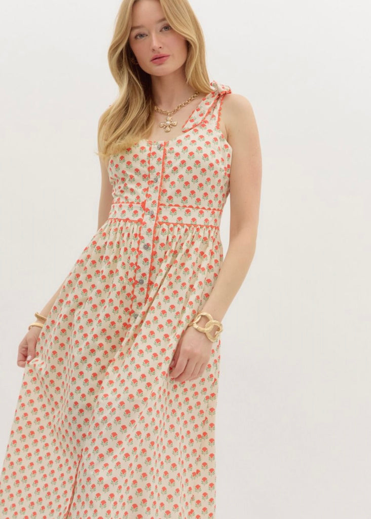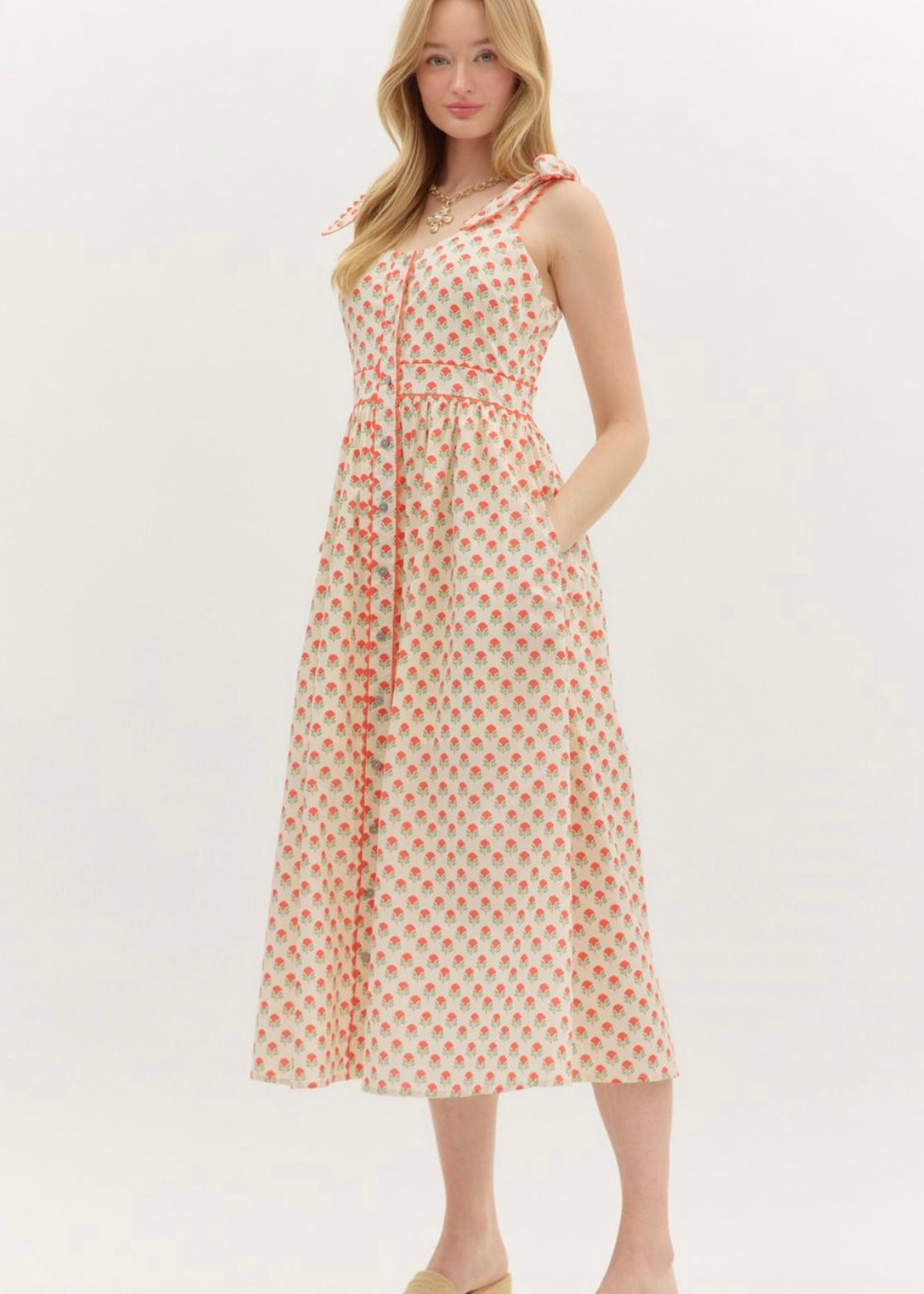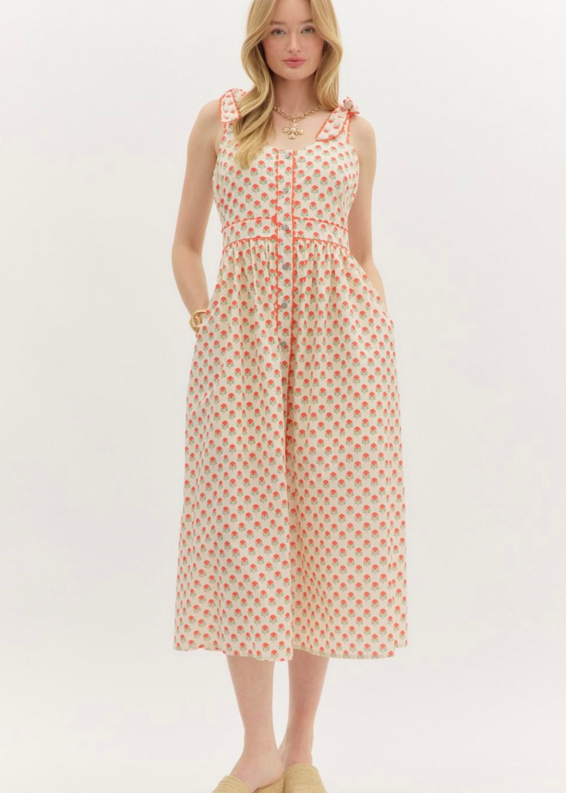 Get ready to frolic in the Jane Dress! This playful midi dress features a beautiful floral pattern and a sleeveless shoulder strap design. The contrast scallop edge bow detail adds a touch of whimsy. Plus, with pockets at the side and a button front closure, this dress is as functional as it is fun.