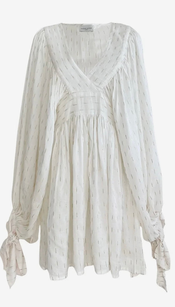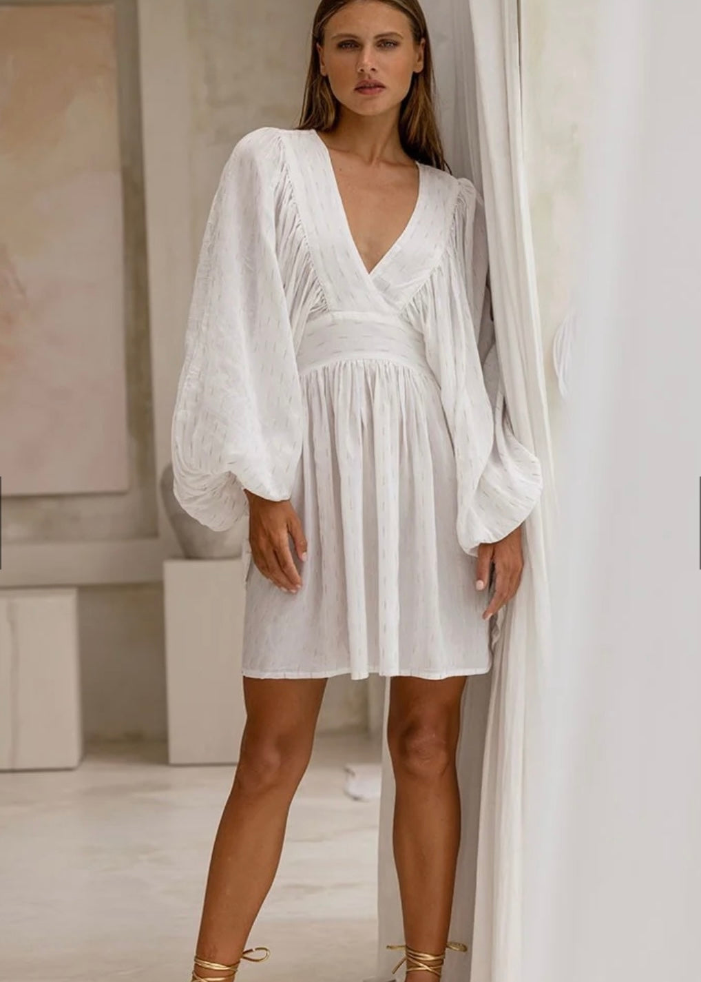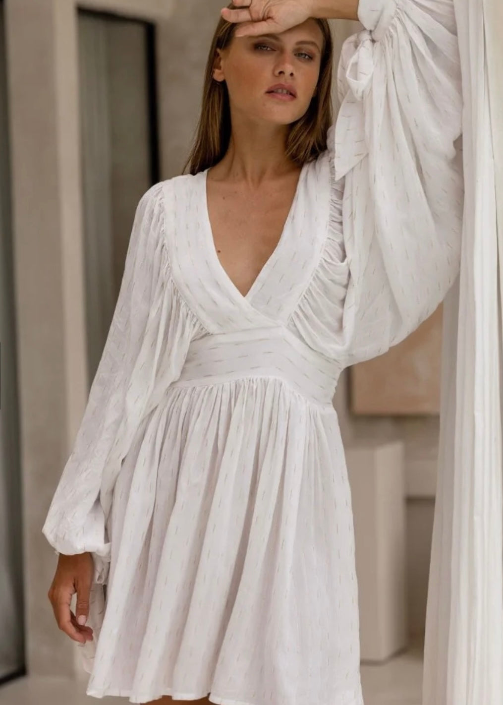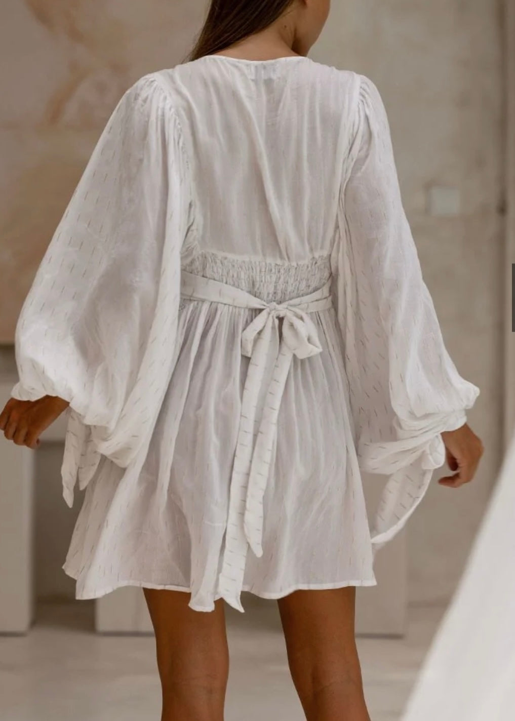 With its airy sleeves adorned with delicate elastic cuffs and a charming V-neckline, this bohemian dress is more than just an outfit - it's an experience. Its immaculate whiteness evokes the simple luxury of beach life, instantly transporting you to the relaxed rhythm of Bali.
