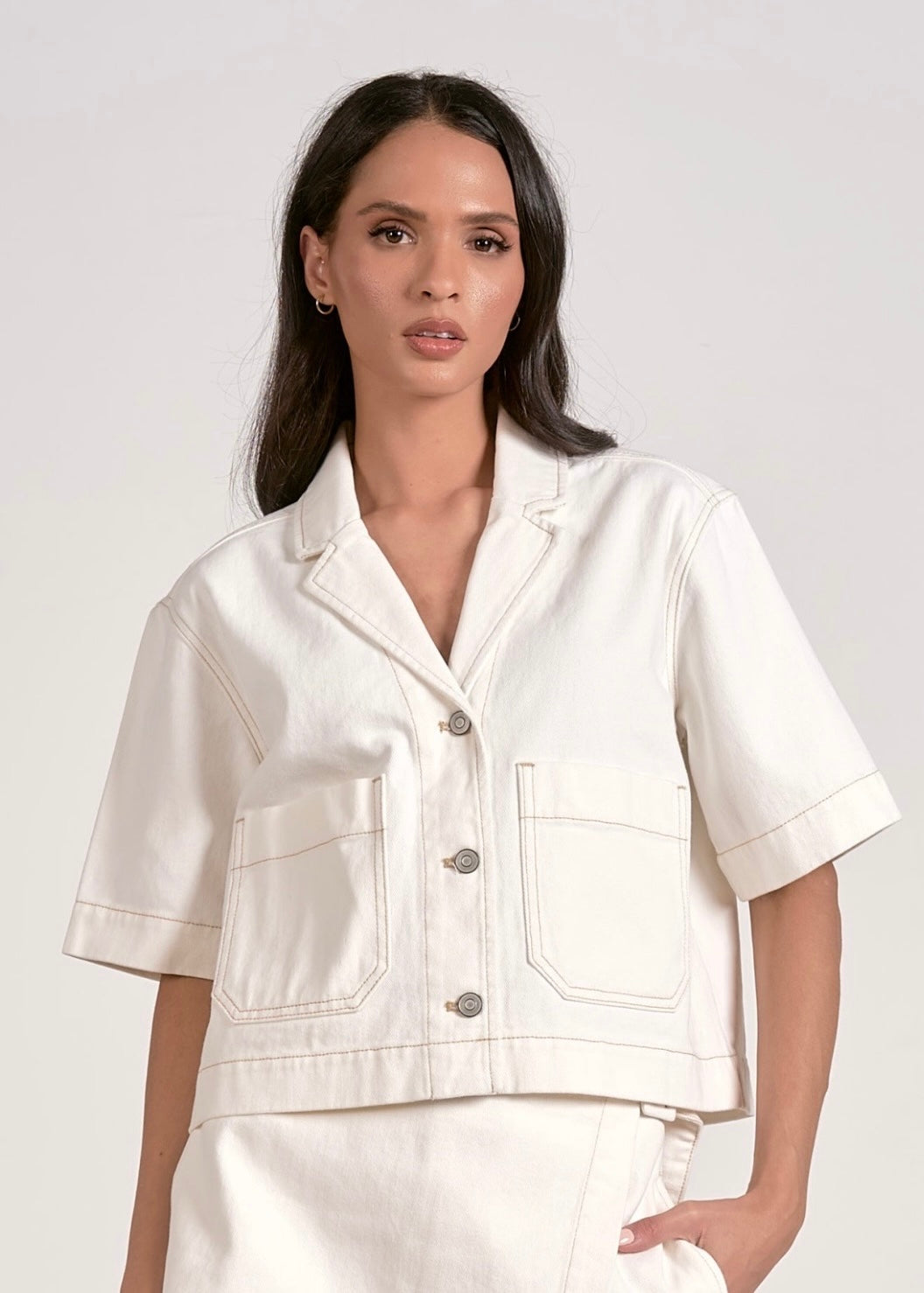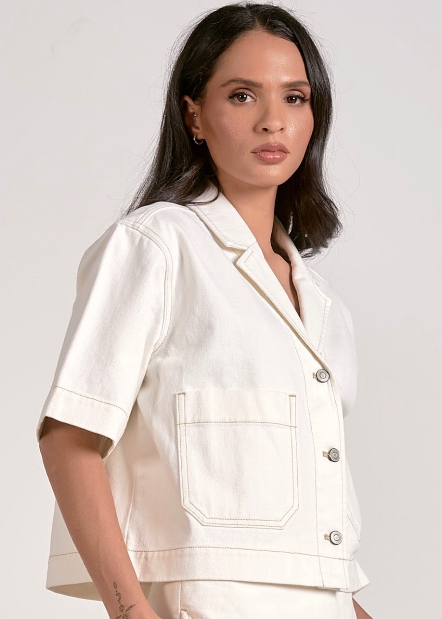 Stay cool and stylish with the Jen Cropped Button Up. Its trendy short-sleeve design, sleek collar, and oversized pockets make it both fashionable and functional, so you can carry all your essentials with ease. Perfect for any occasion, this top is a must-have for your wardrobe!