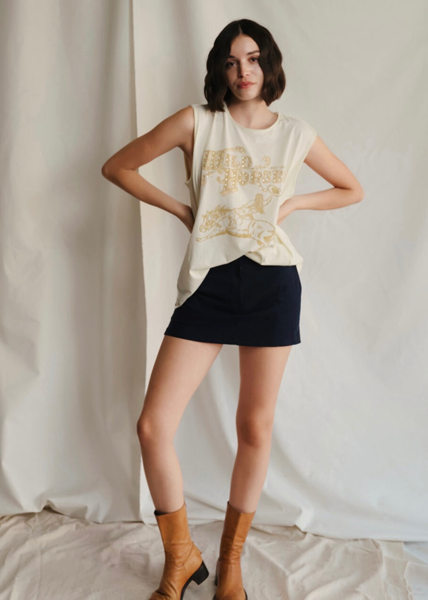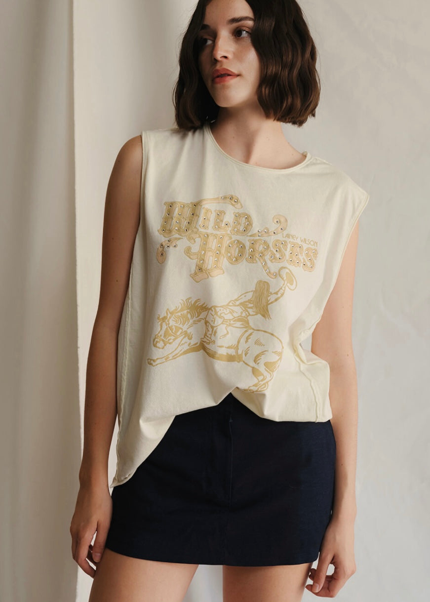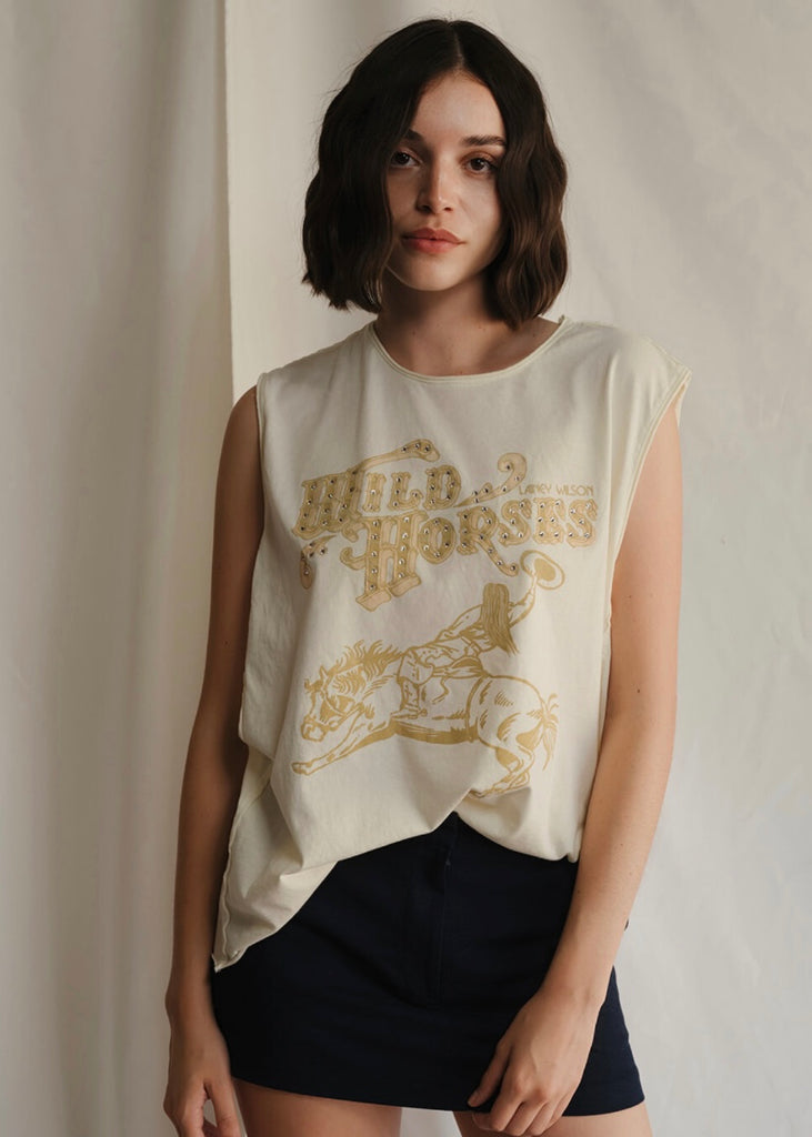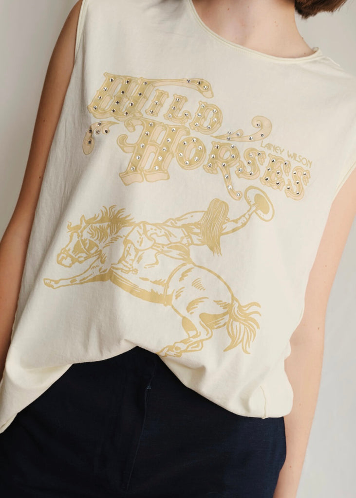A Wink of Wild, a Sparkle of Bold, with a Touch of Country Grit. This ecru tunic in soft organic cotton has a hint of edge with its raw-cut sleeves, channeling a bit of that Lainey Wilson spirit. The Girl Rider graphic adds a touch of spirited charm. But the real eye-catcher? A bedazzled Wild Horses print that brings a playful shimmer to its untamed vibe, reminiscent of Lainey's own blend of strength and sparkle. It's a piece that knows how to have fun without being shy – a little bit rebel, a little bit radiant, and a whole lot country cool.