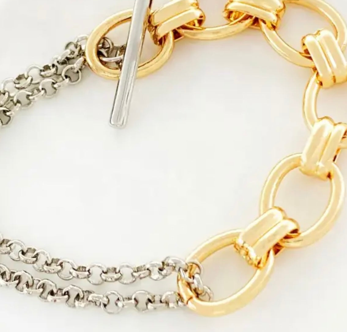 Mixed Up Links and Two Tone Chains chunky Link Bracelet. Non Tarnish. Hypoallergenic We love a stack and especially one that looks so casually thrown together. This is steel Chain that is plated to last.