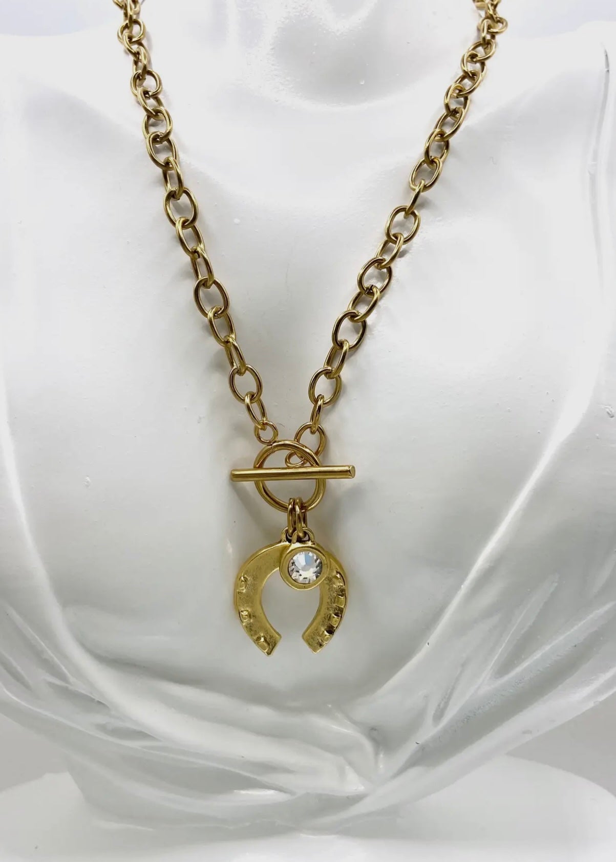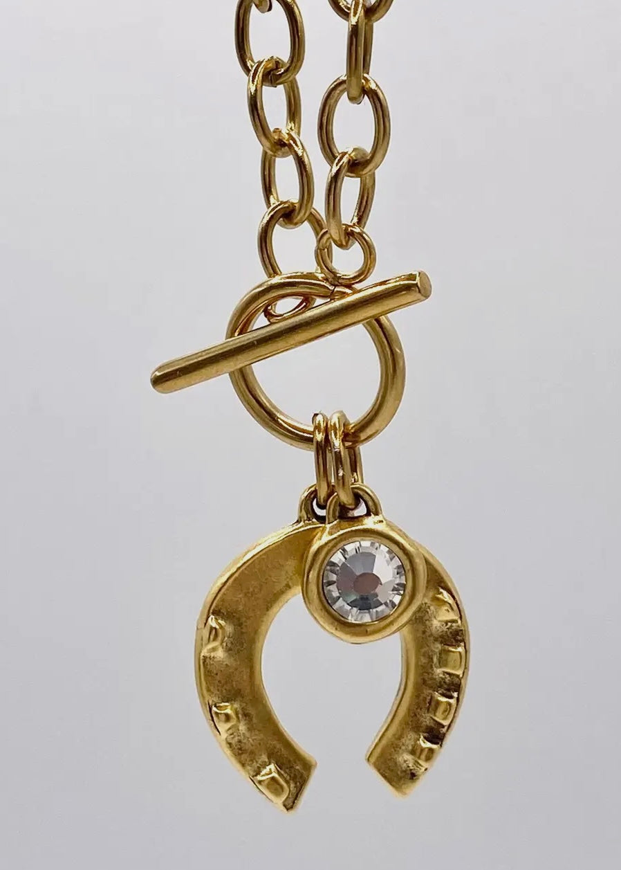 Bring a touch of timeless luck and elegance to your collection with this hand casted golden horseshoe necklace, accented by a sparkling Swarovski crystal centerpiece.