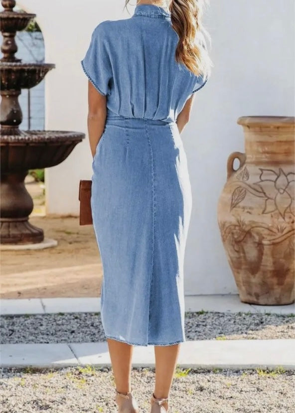 Flaunt your style with this playful mid-length dress! Its unique slit collar adds a touch of quirk to the classic design, while the pleats provide both a flattering fit and effortless movement. Perfect for any occasion, this dress is sure to turn heads!