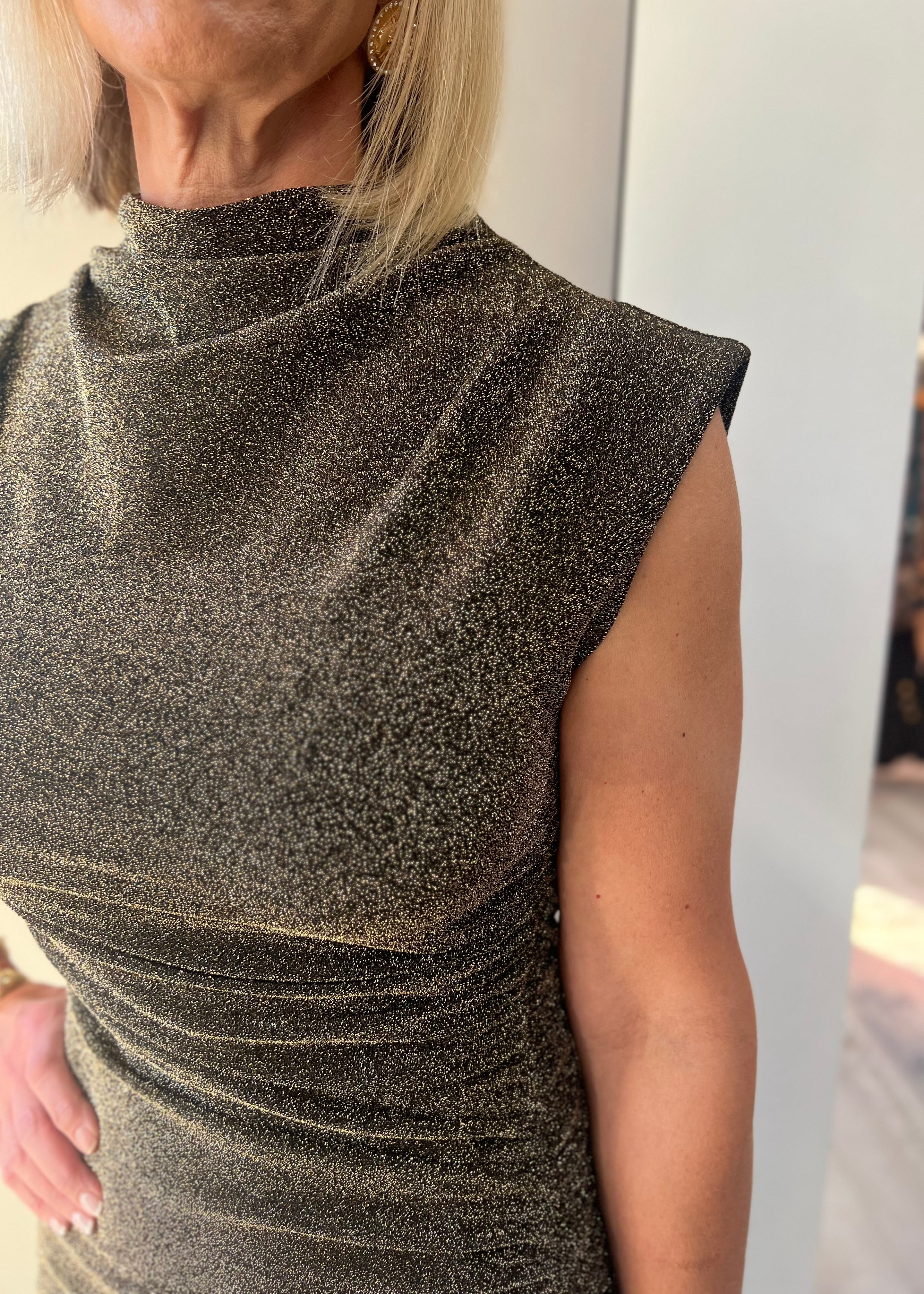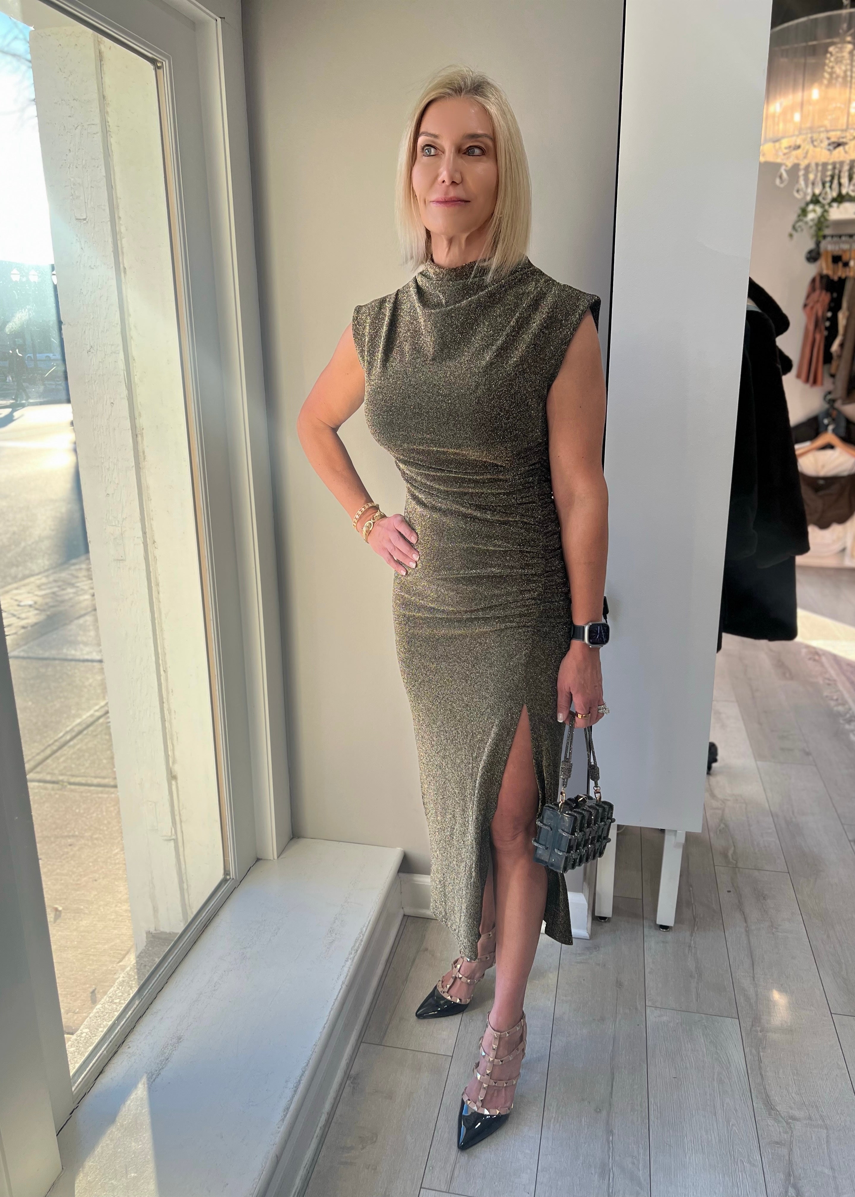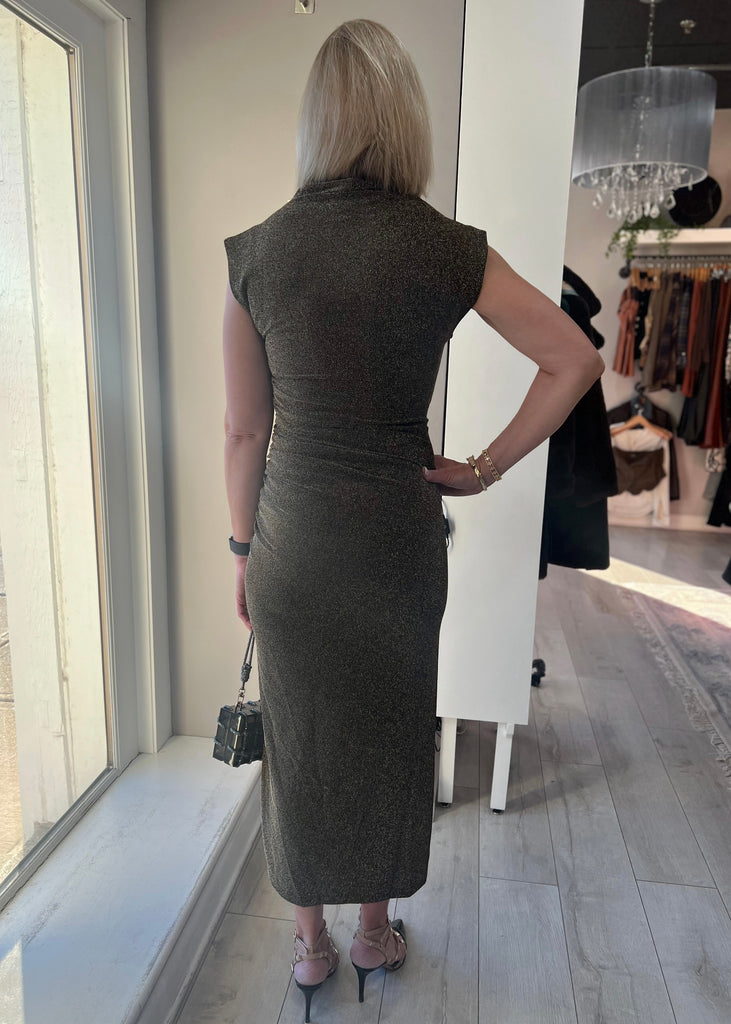 Metallic Mock Neck Midi Slit Dress - L is backordered and will ship as soon as it is back in stock.