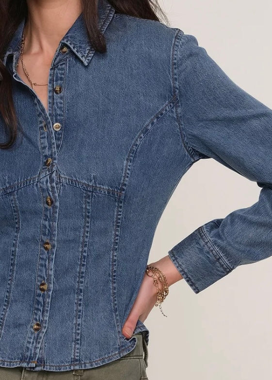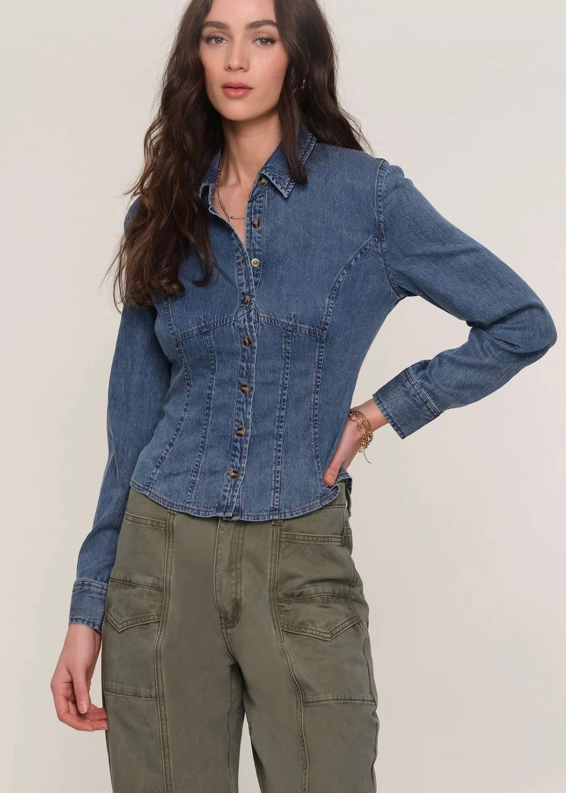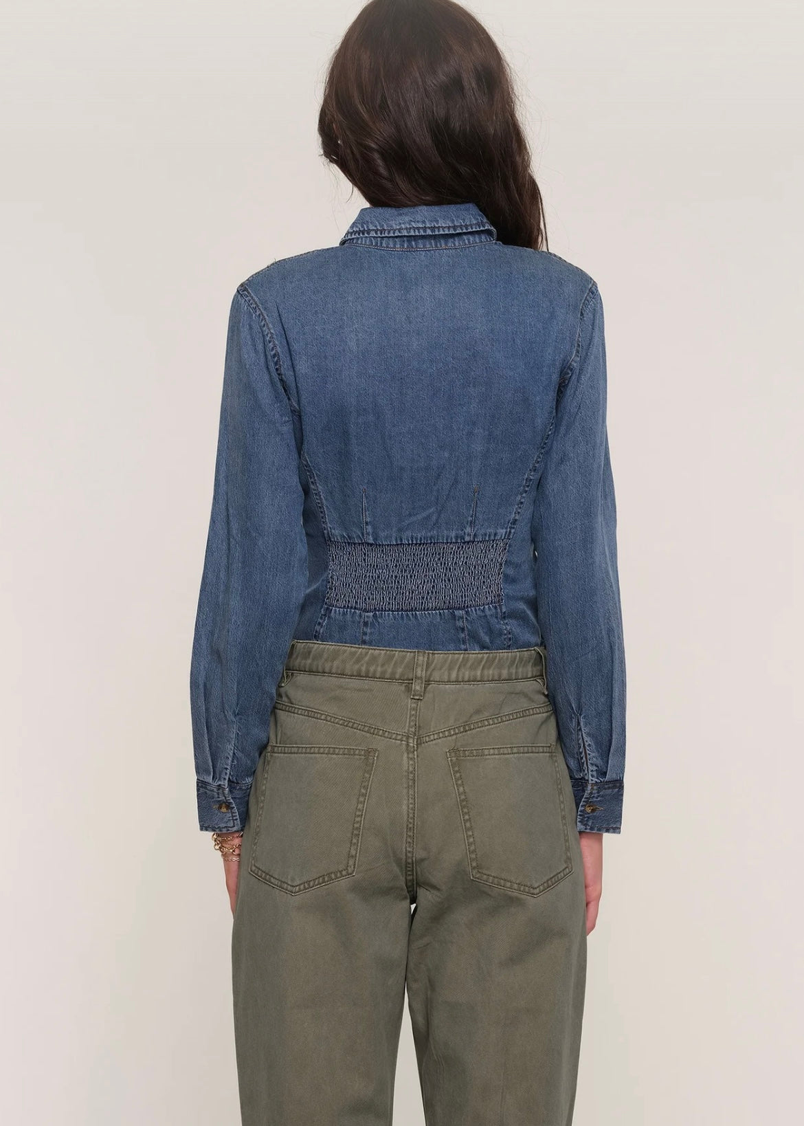 The Mitchell Shirt is a slim fit, denim shirt. It features corset seaming, and has smocking at back for an easy fit.