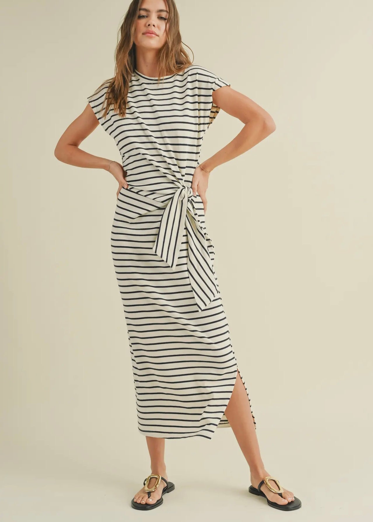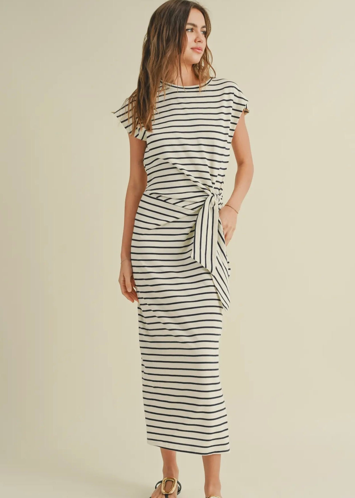 Indulge in the effortless elegance of the Muse Stripe Dress. This sophisticated dress features a timeless stripe pattern and a beautifully crafted knot detail, adding a touch of luxury to your wardrobe. Perfect for any occasion, this dress exudes a tasteful and exclusive style.