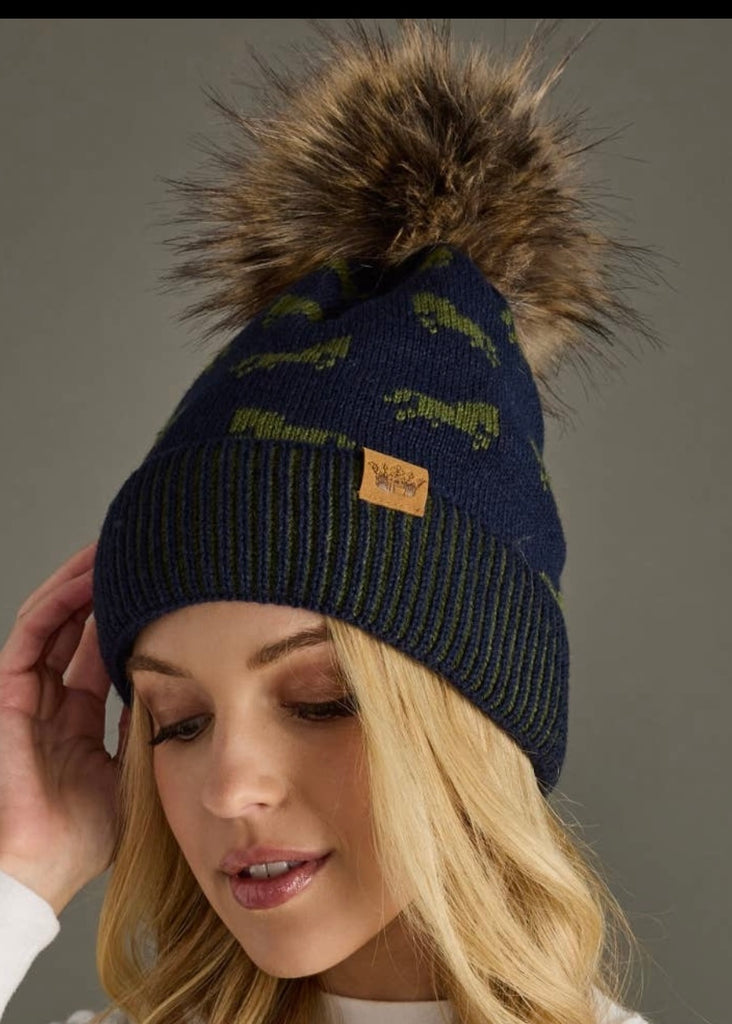 Navy Horse Pattern Pom Hat