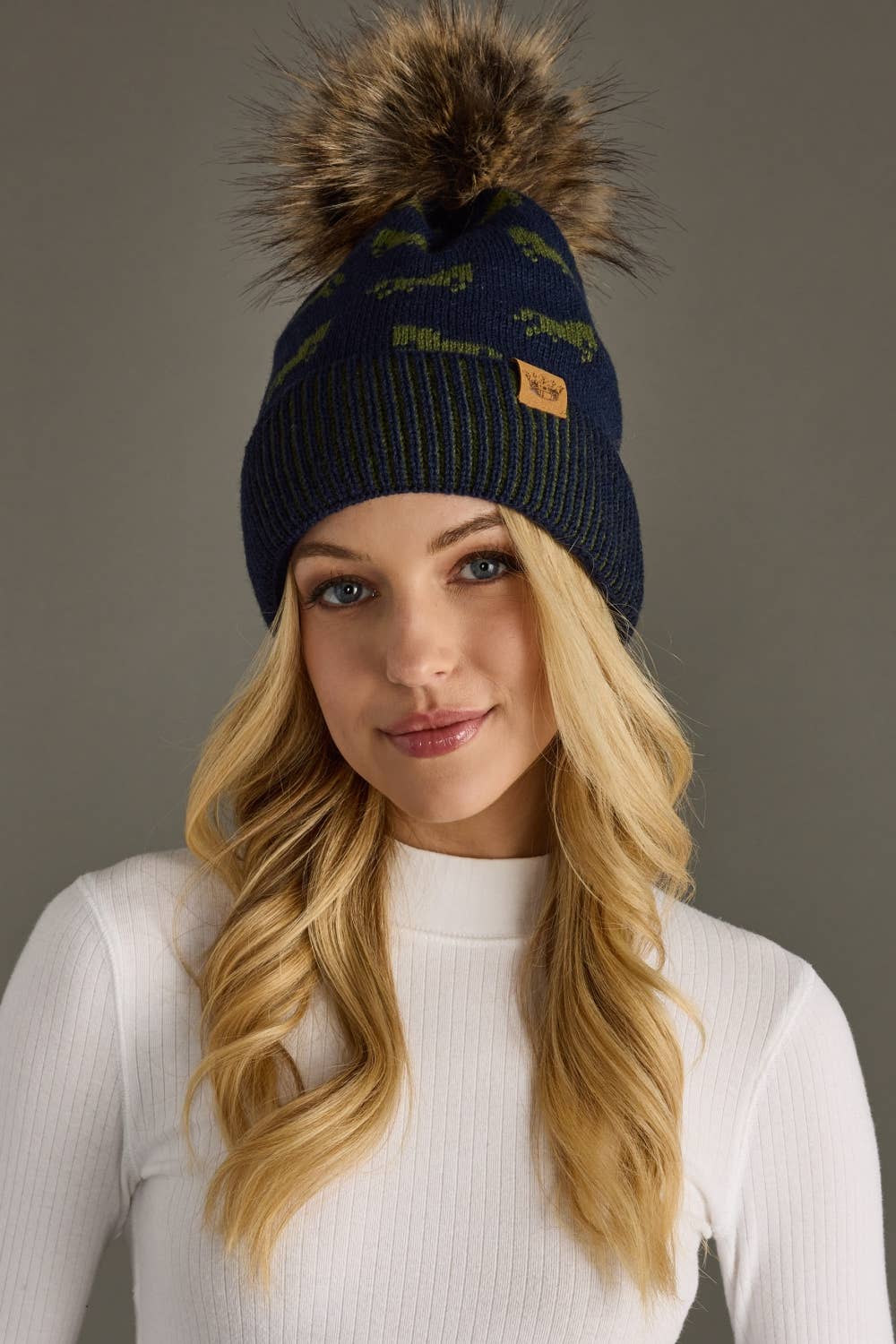 Boasting a trendy navy horse design and a playful faux fur pom pom