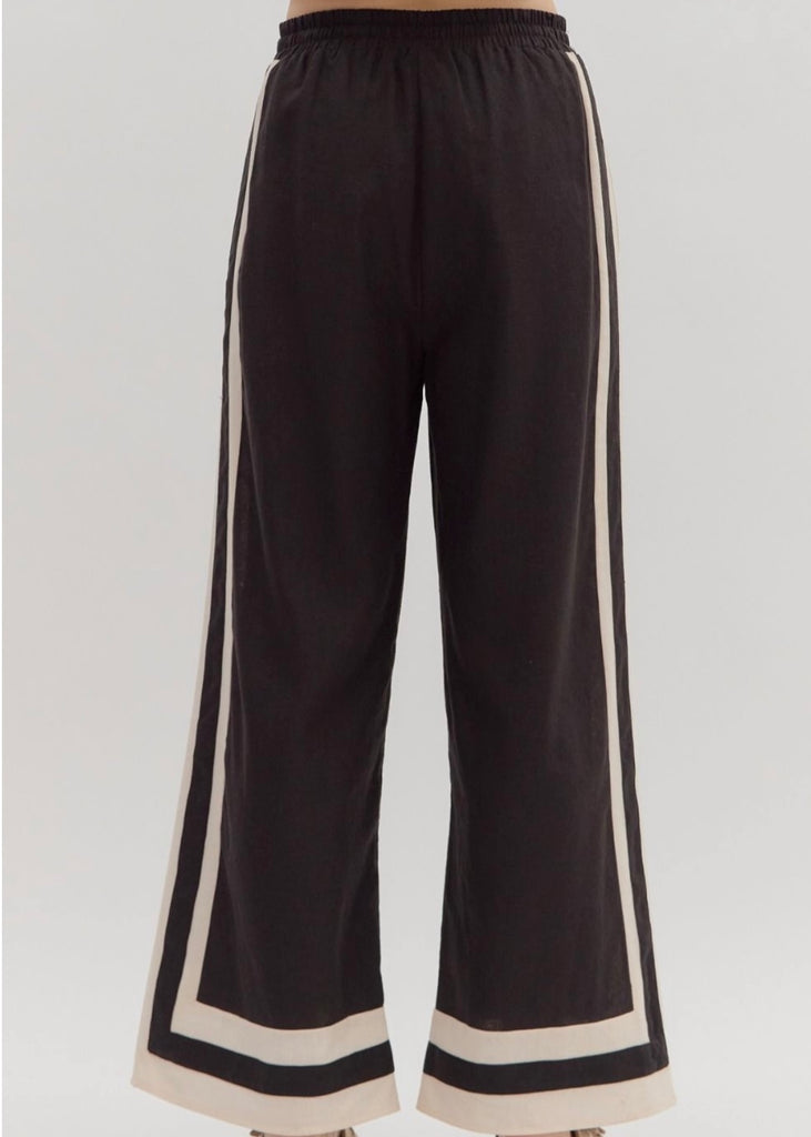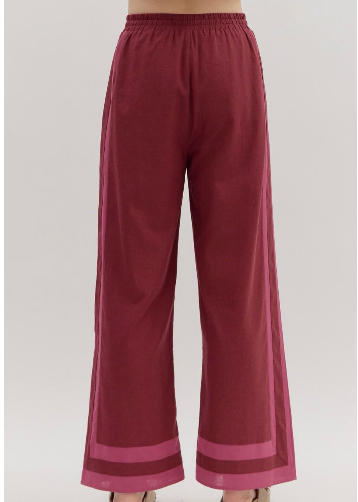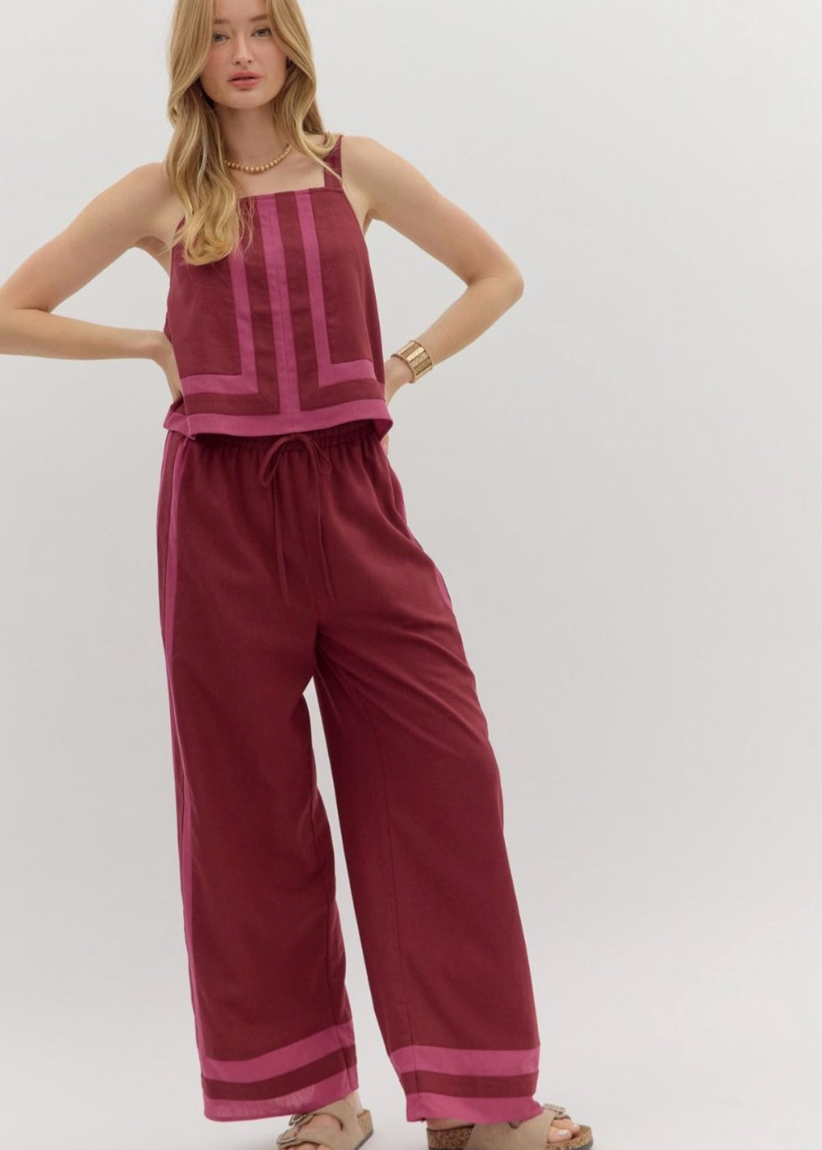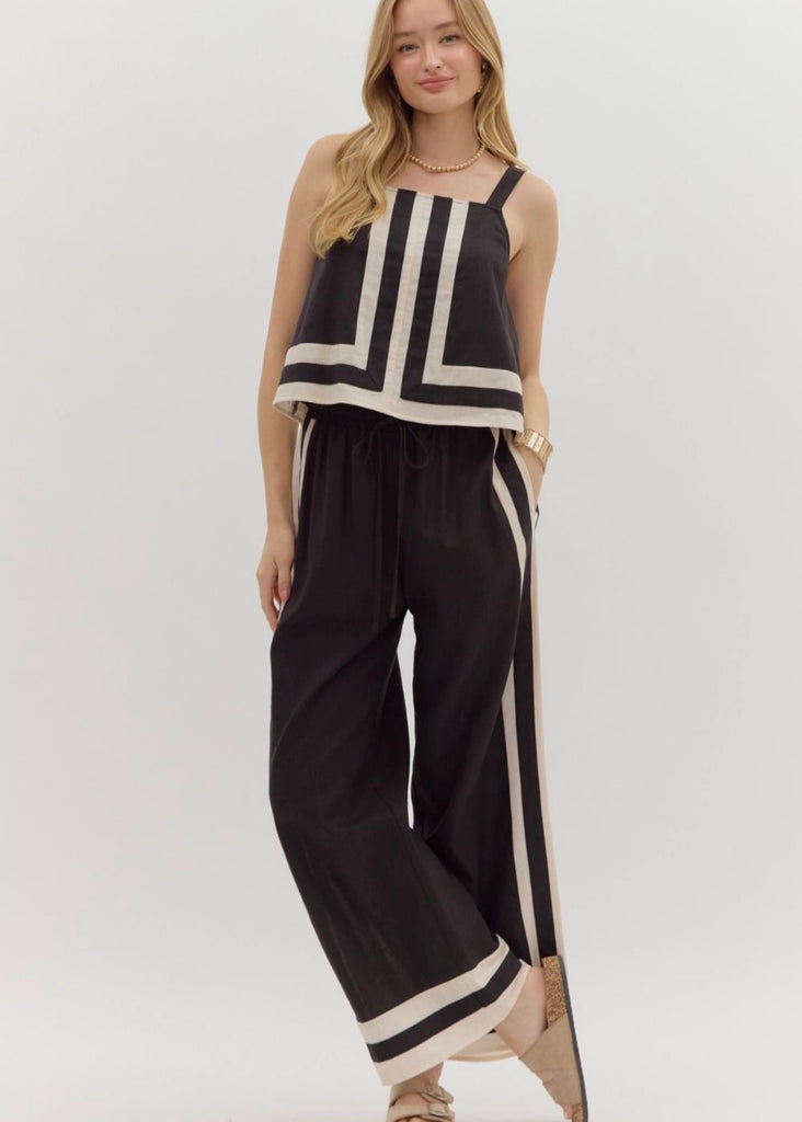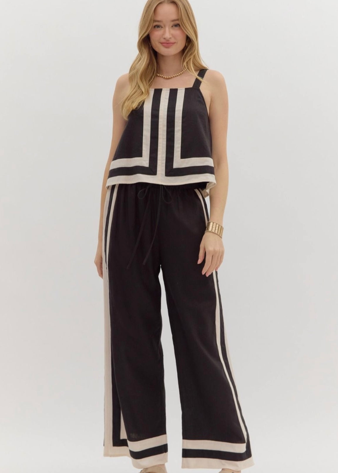 These solid high waist wide leg pants feature a chic contrast accented abstract border, and a drawstring adjustable waistband for comfort. Lined and non-sheer, these lightweight woven pants are the perfect pant for a day, evening or beach look. Complete the look with the Nora Tank for a stylish matching set.