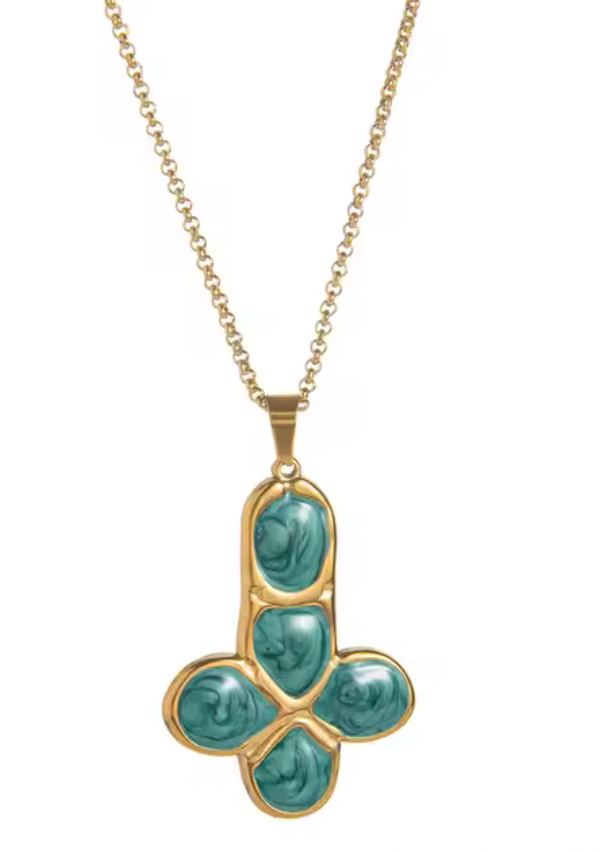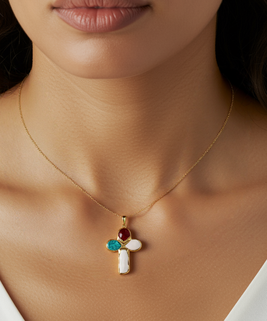 Paloma is our soft and organic look of gemstone cross. Stainless Steel 14K yellow gold plated The Cross is Forcaté style enamel over gold. This ensures a multi dimensional look. Each Station of the Cross is Organic and imperfect On a 16" O Chain 2" extender Stainless Steel Hand Enamel Pendant is 2.5" long Lobster Claw clasp Hypoallergenic Waterproof