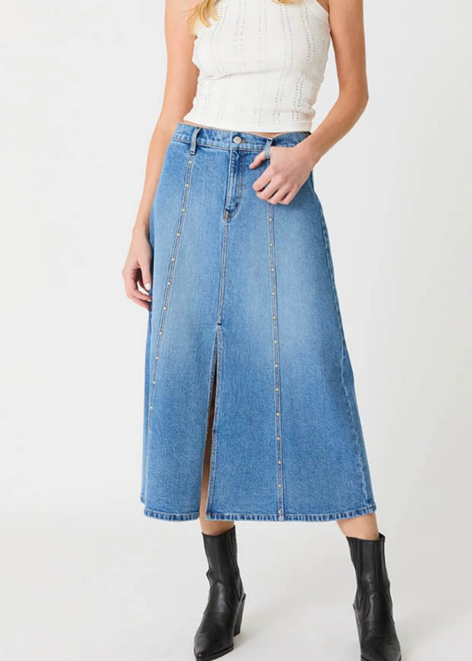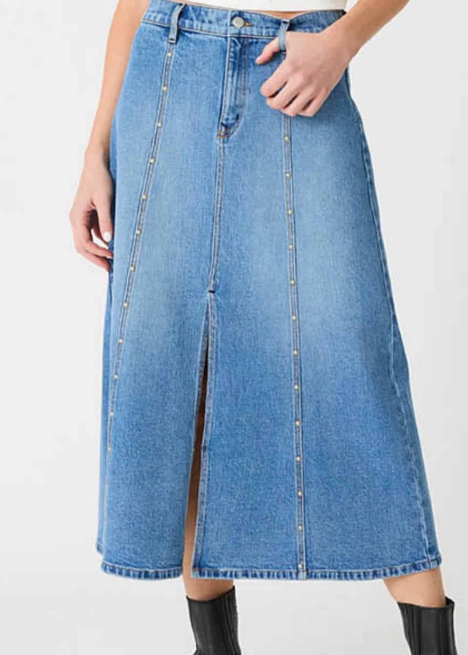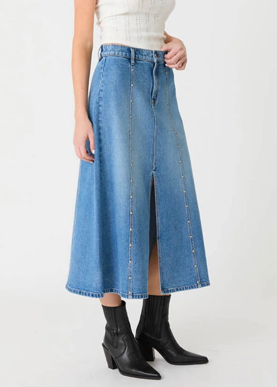 Studded details on the front give this skirt a stylish edge, making it an effortless piece to elevate your everyday wardrobe.