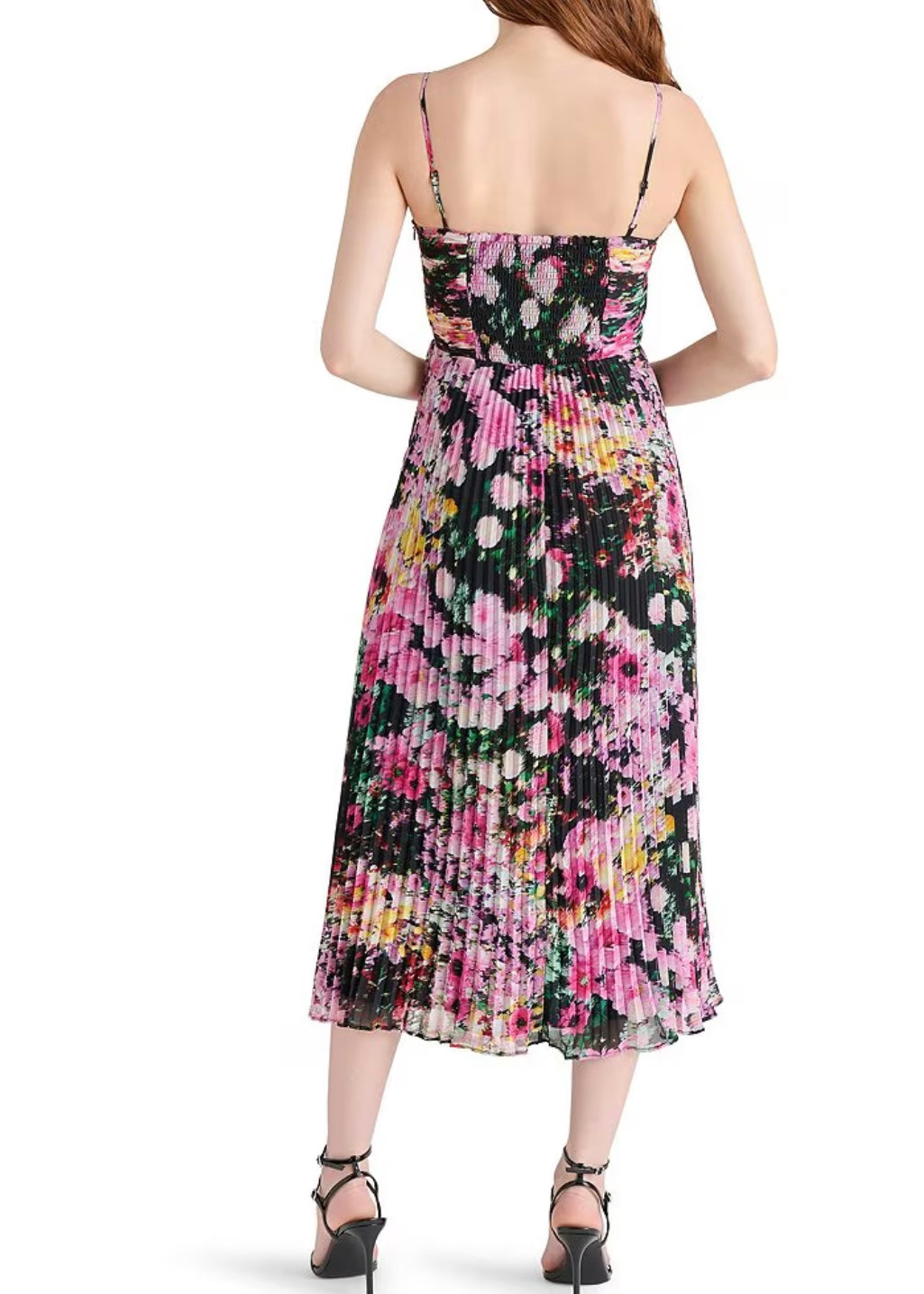 This midweight plisse chiffon fabric dress boasts a flattering hidden side seam zipper and adjustable shoulder straps for a customizable fit. The cinched elastic at the back ensures maximum comfort without compromising on appearance.