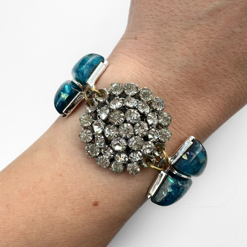 This bracelet was made using a combination of both new and repurposed vintage materials. The round centerpiece was a vintage button, containing clear glass rhinestones in a silver-tone pronged setting. It's flanked by vintage blue confetti lucite midcentury links, and solid brass curb chain.