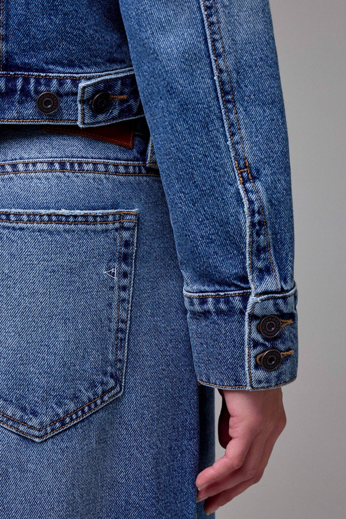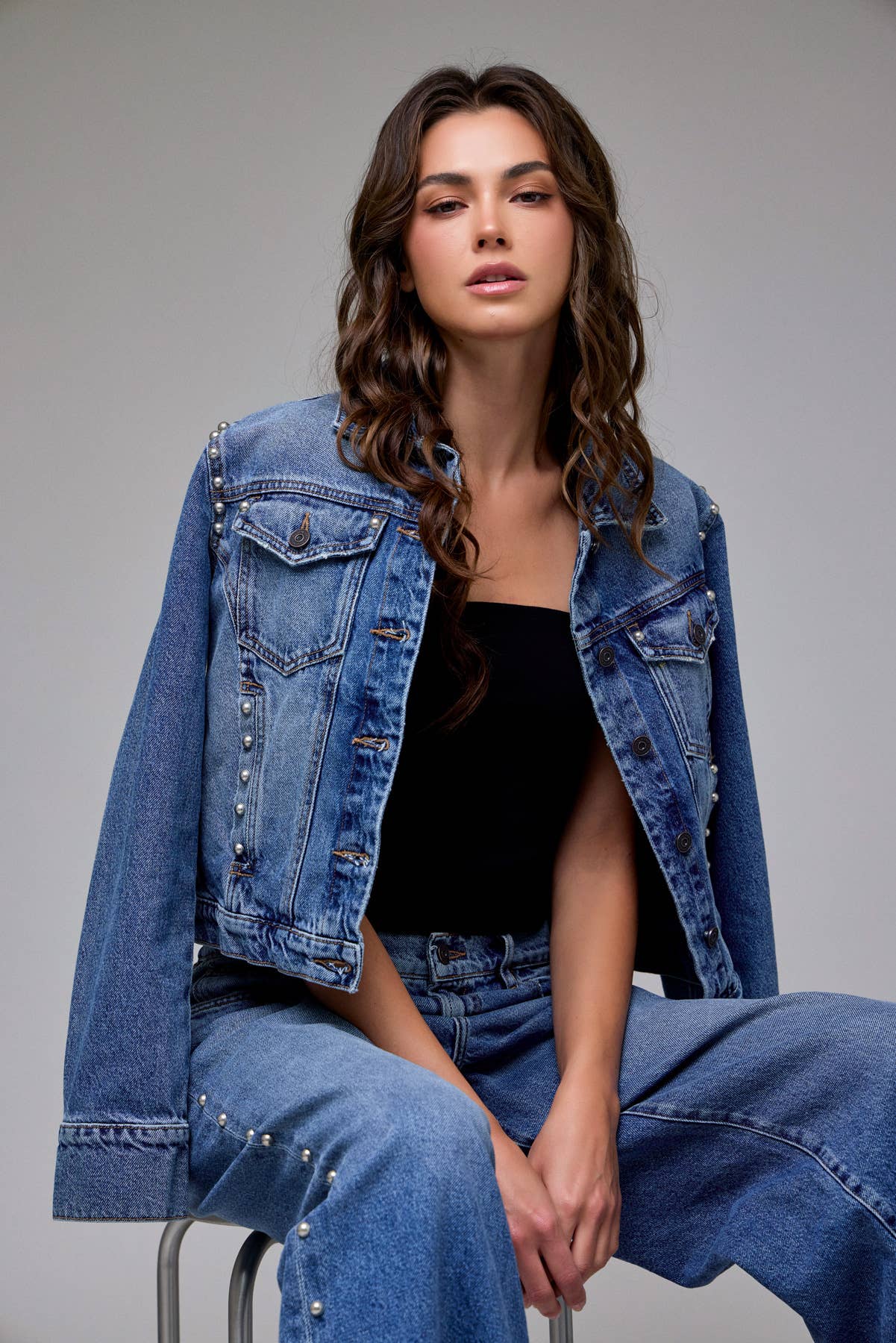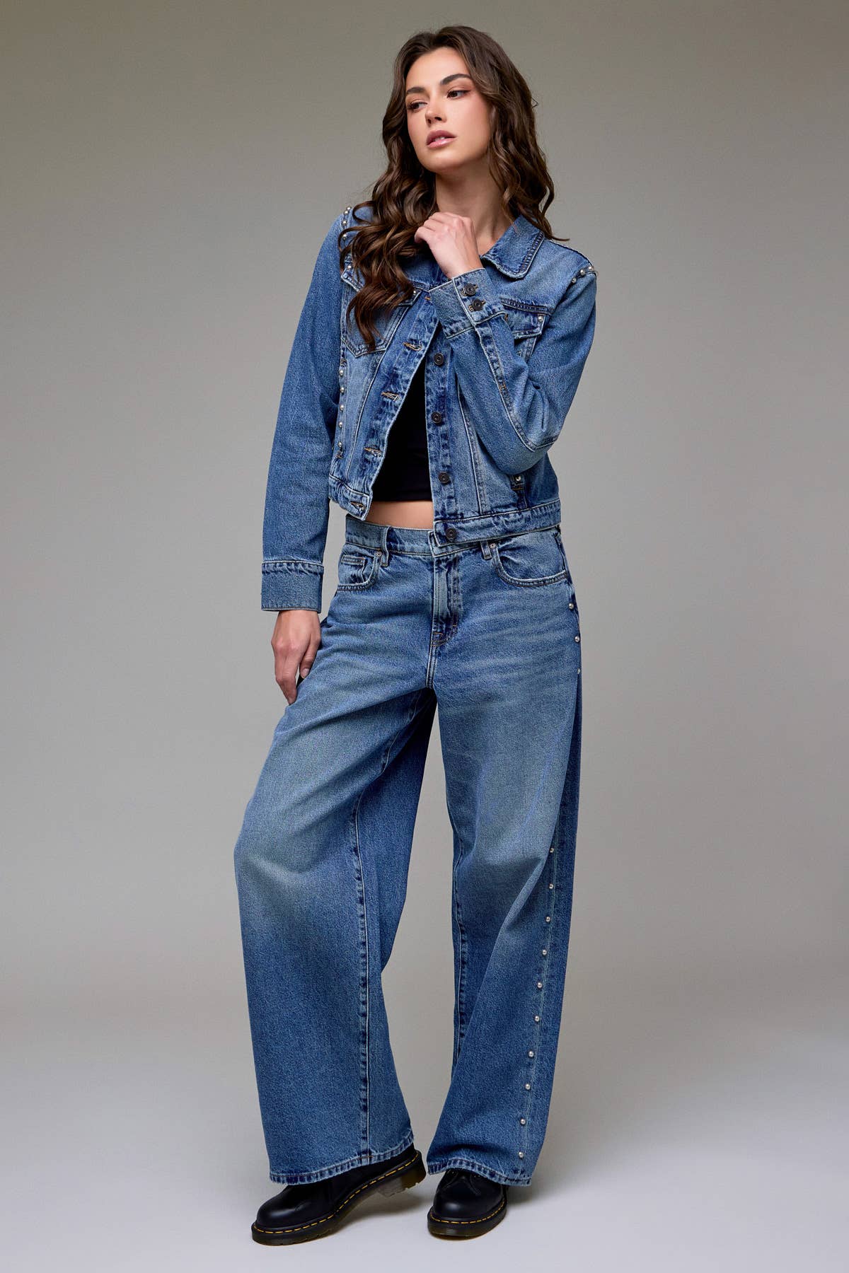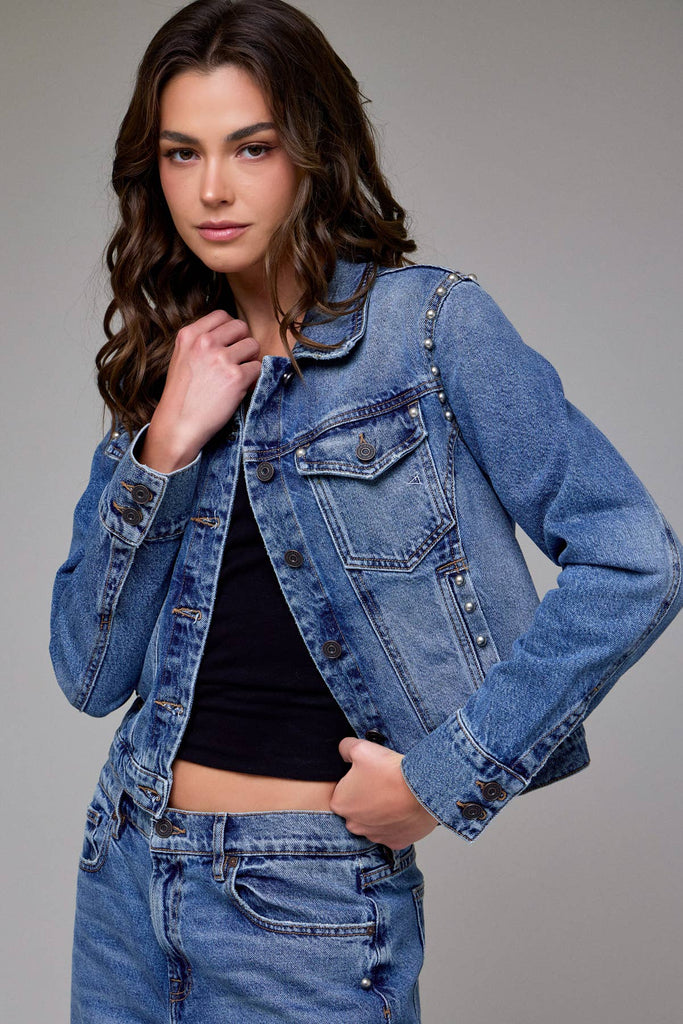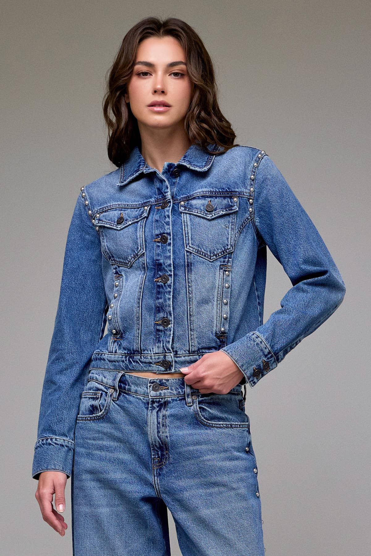 Made with 100% cotton and featuring a medium wash, this fitted jacket boasts stud details for a bold look