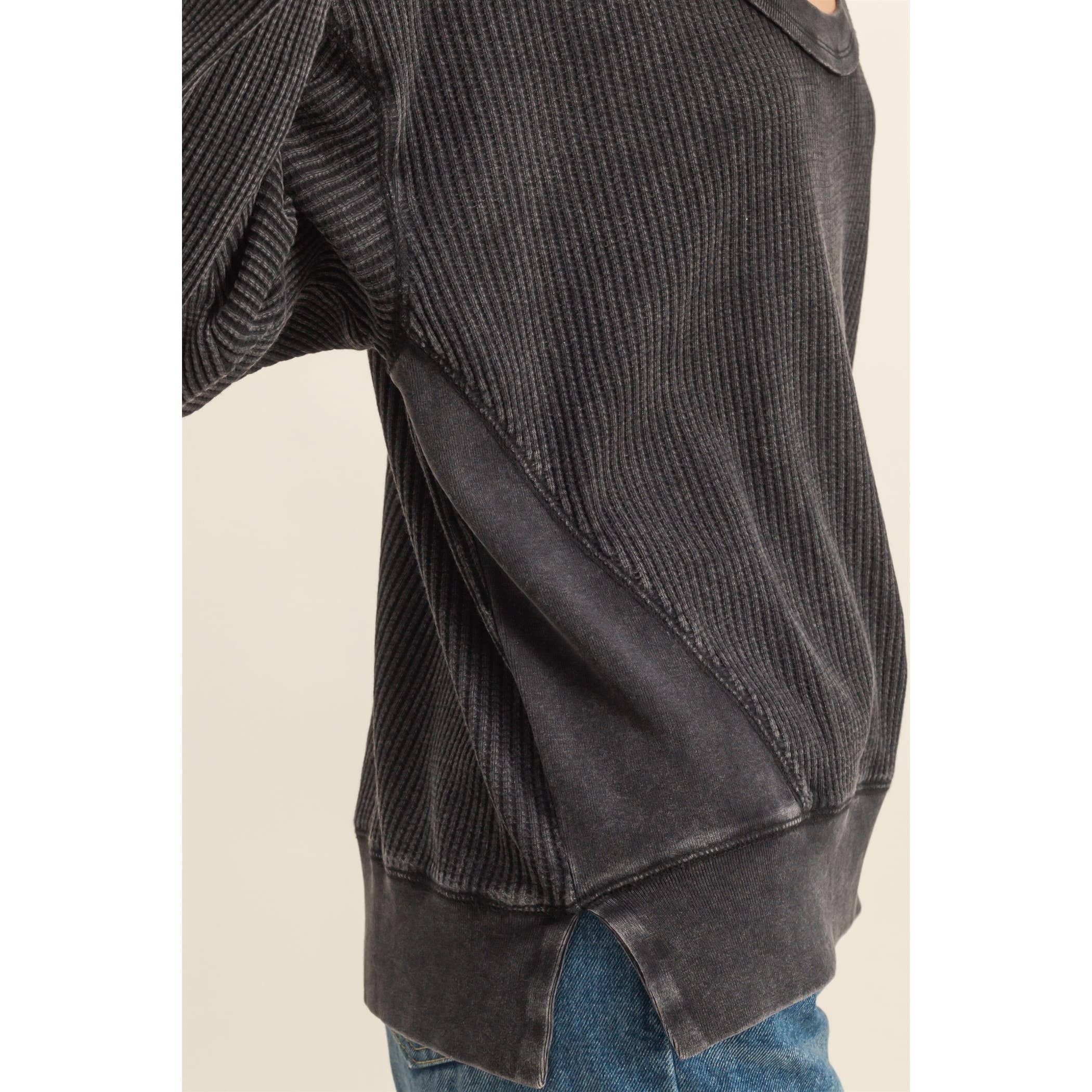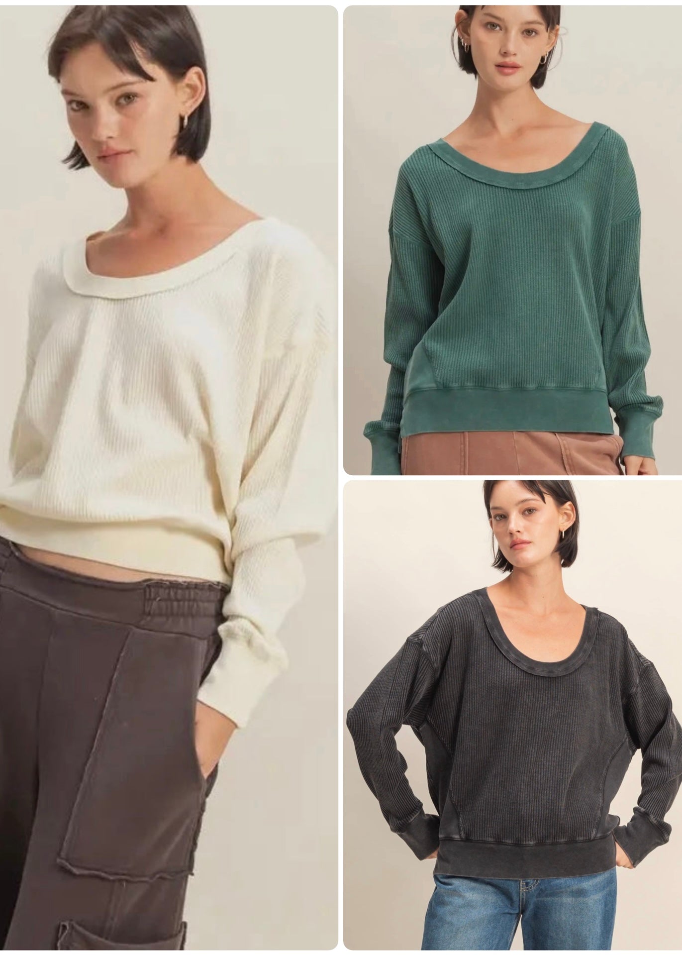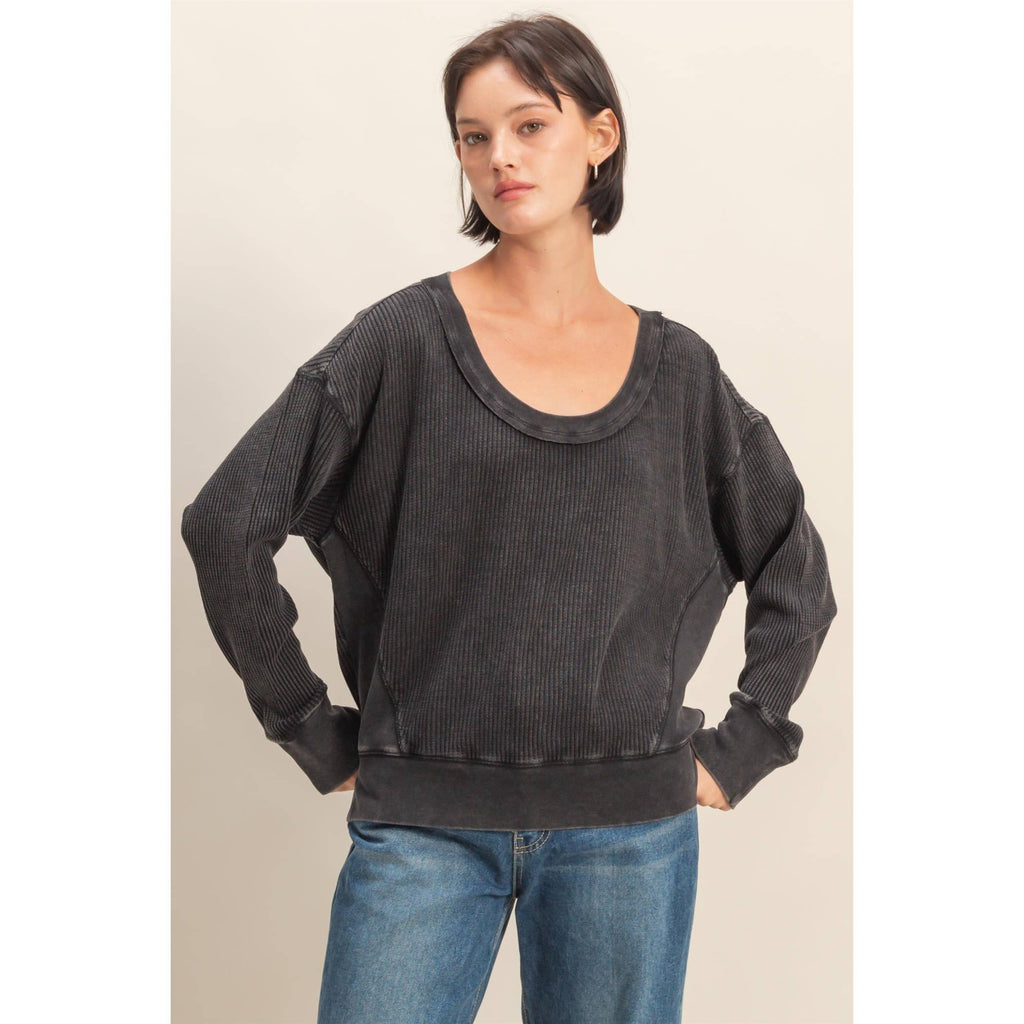 Featuring a mineral wash construction, this piece has a scoop neckline and long sleeves with drop shoulders