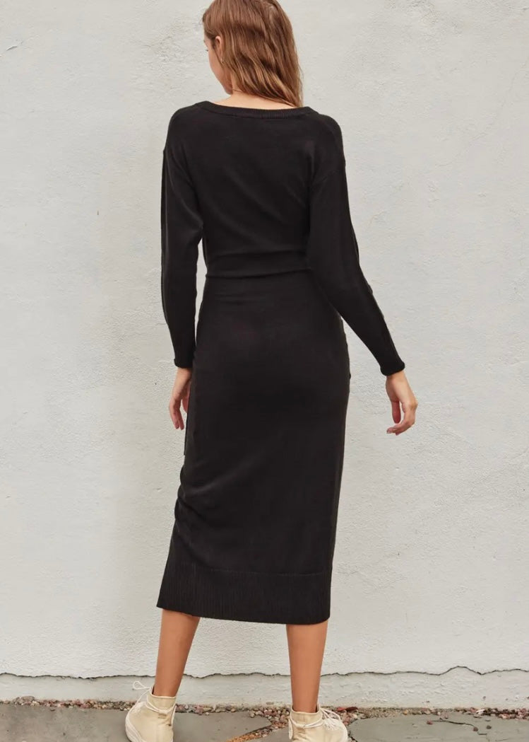 This midi dress is a must-have for any fashion-forward woman. Designed with a pull-over style and a midi length, this dress features a unique wrapping top layer with a buckle fastening for a touch of modern flair. The snap button closure at the neckline adds a functional detail to this chic piece.