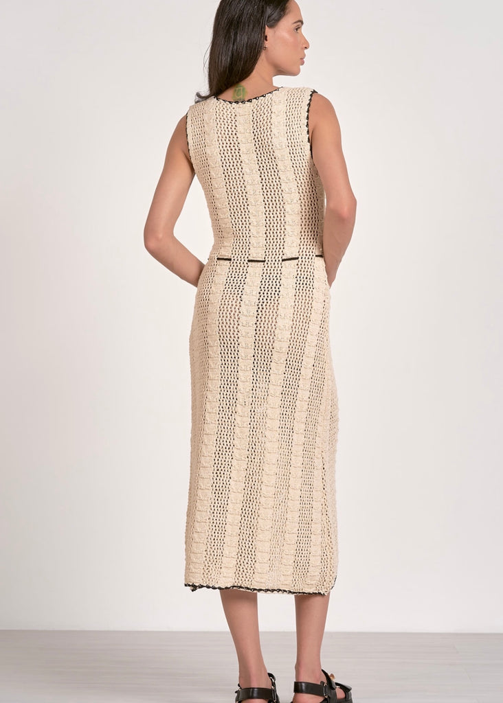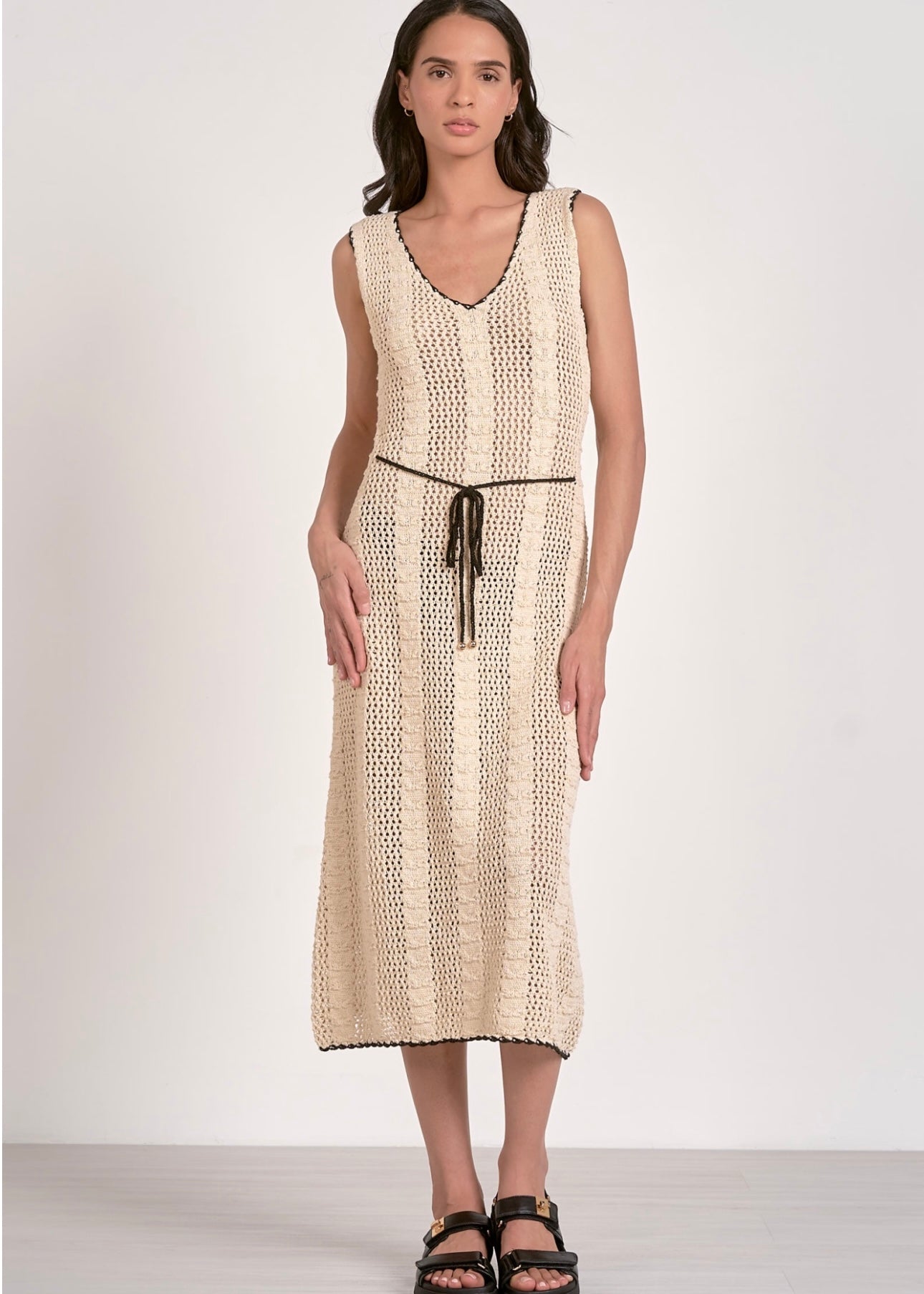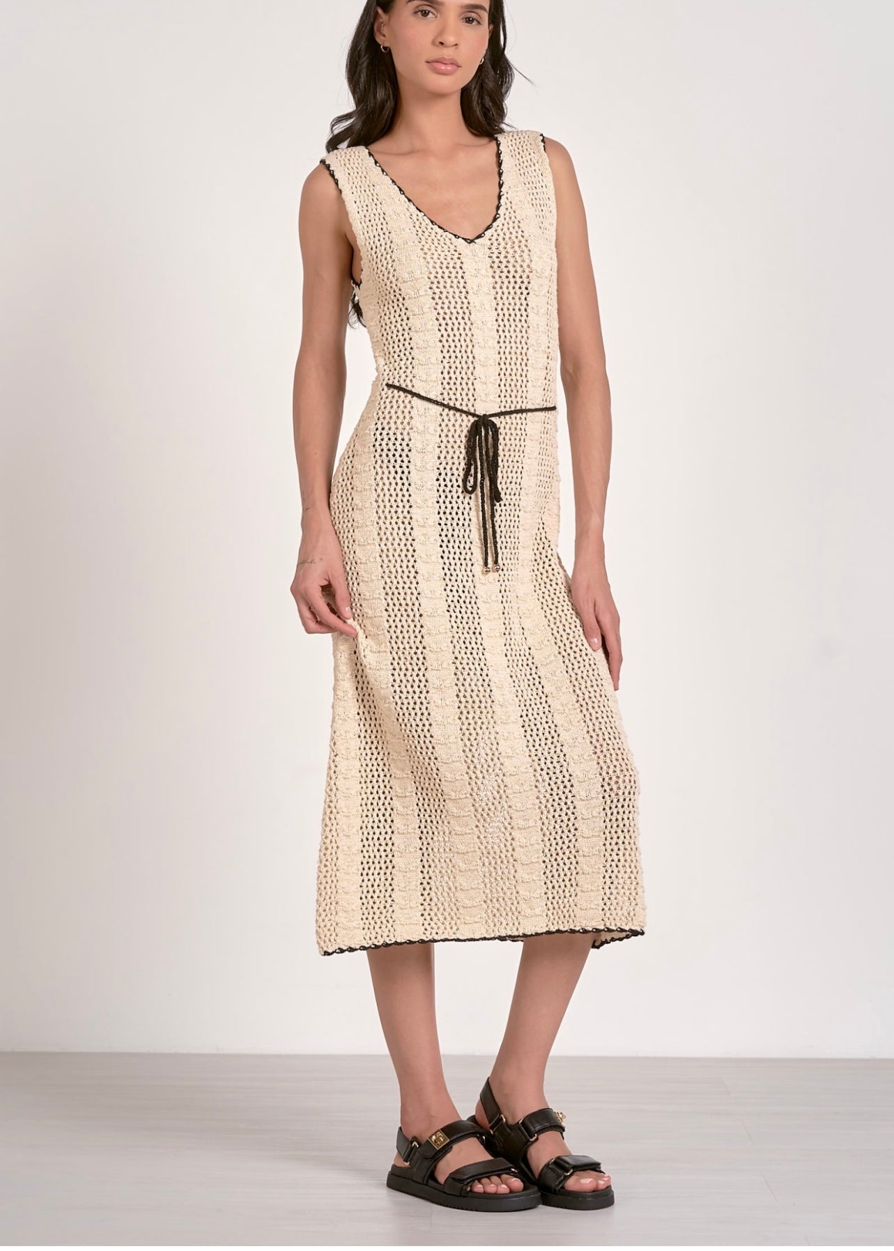 Be a trendsetter in the Stella Dress! This crochet dress features a unique black contrasting trim and a flattering tie waistband. Show off your playful style with this statement piece.