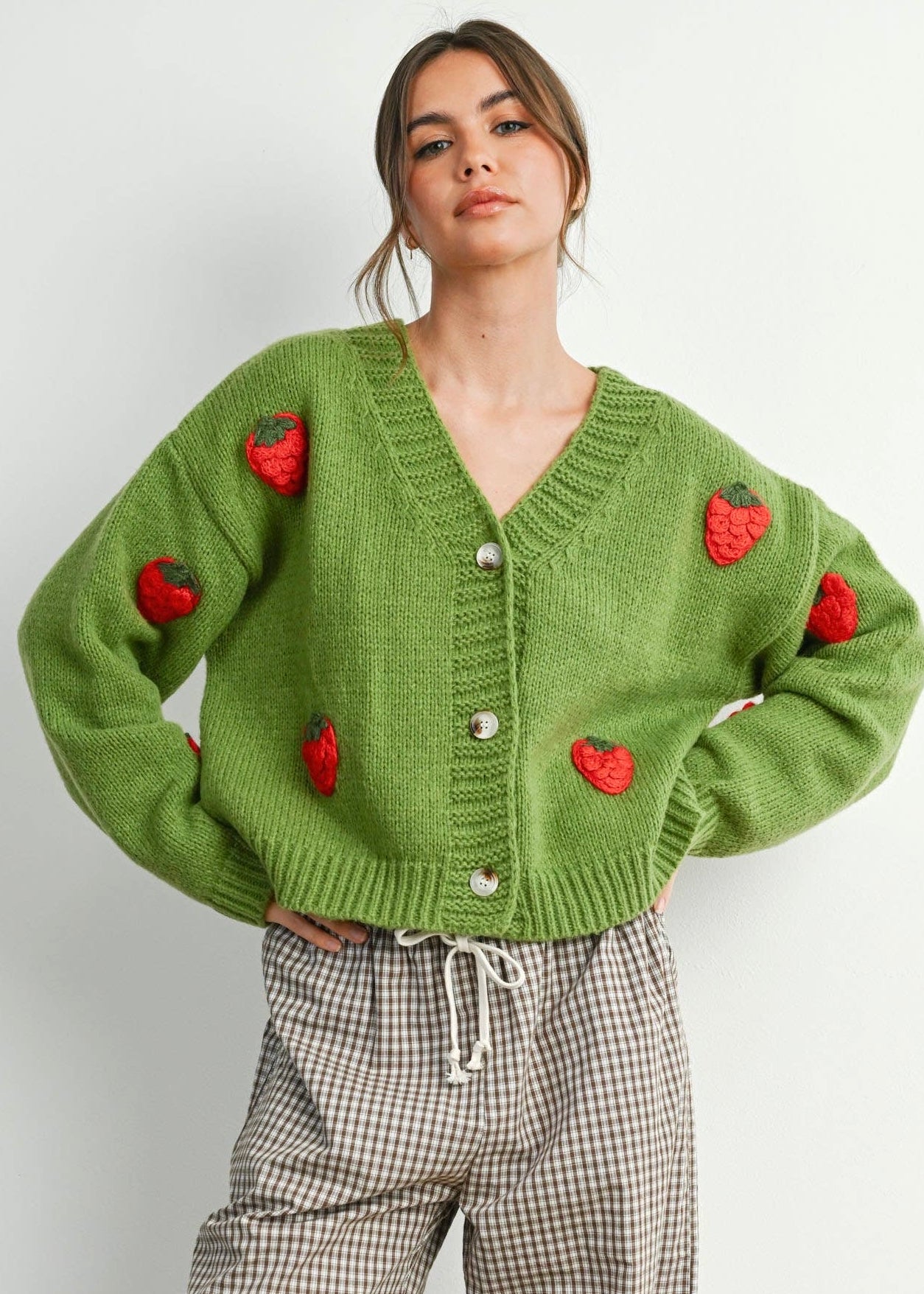 Elevate your wardrobe with our delightful Strawberry Embroidered Cropped Cardigan, a charming blend of style and comfort. This soft, lightweight cardigan features an eye-catching strawberry embroidery that adds a playful touch to any outfit. The cropped length is perfect for layering over your favorite dresses or high-waisted jeans, creating a flattering silhouette that’s both trendy and timeless.