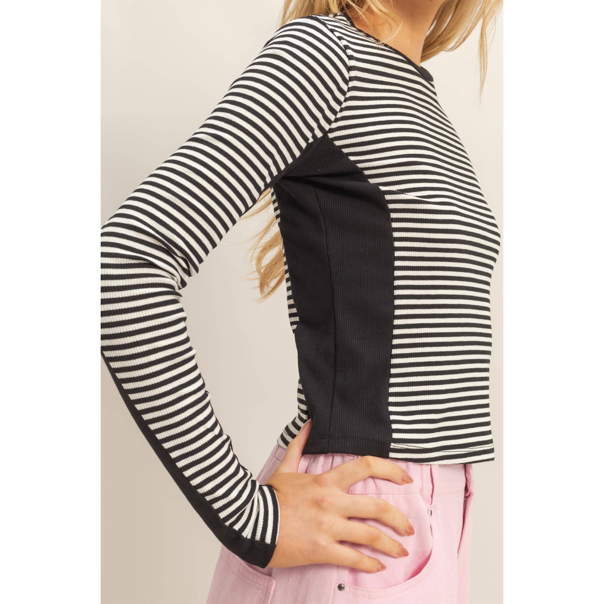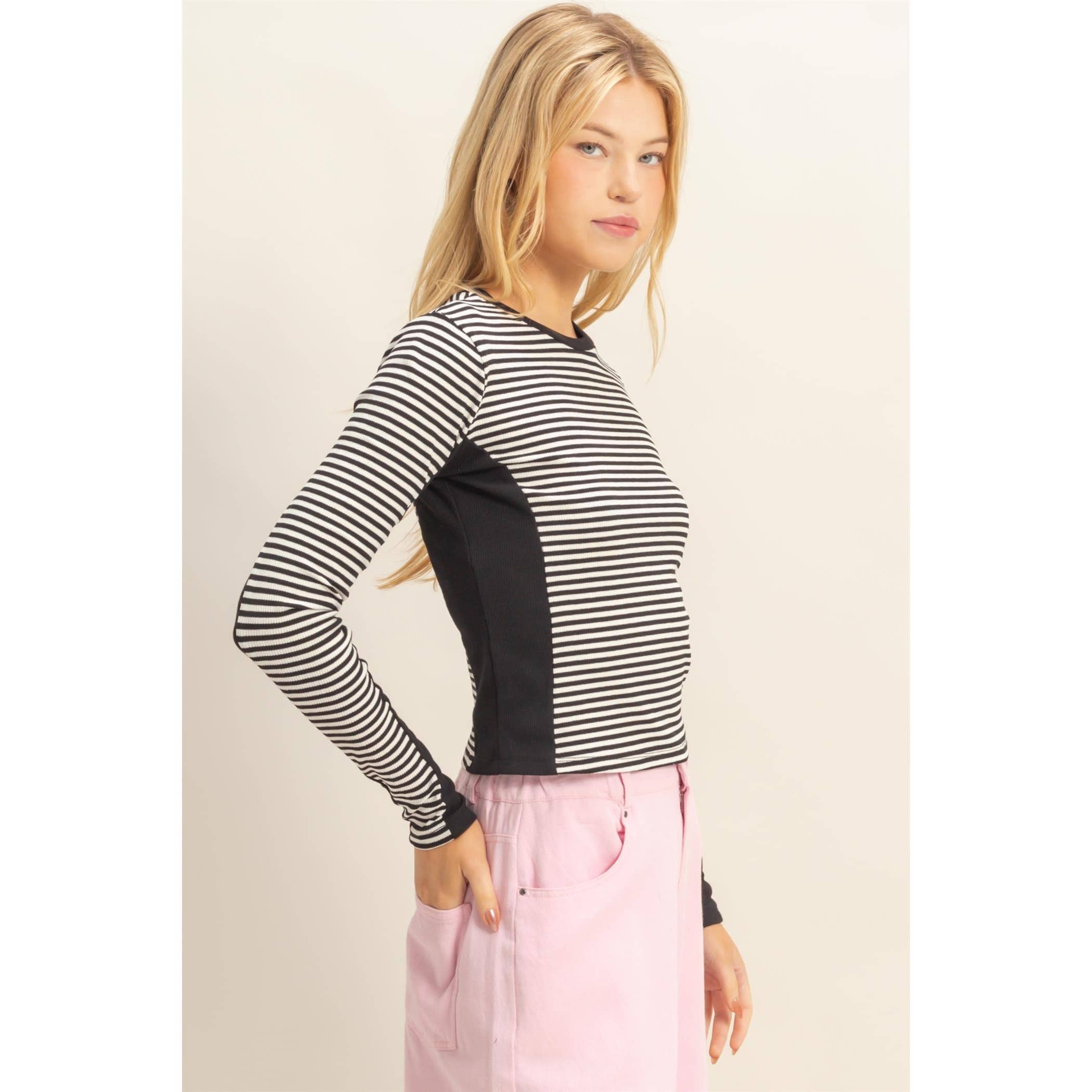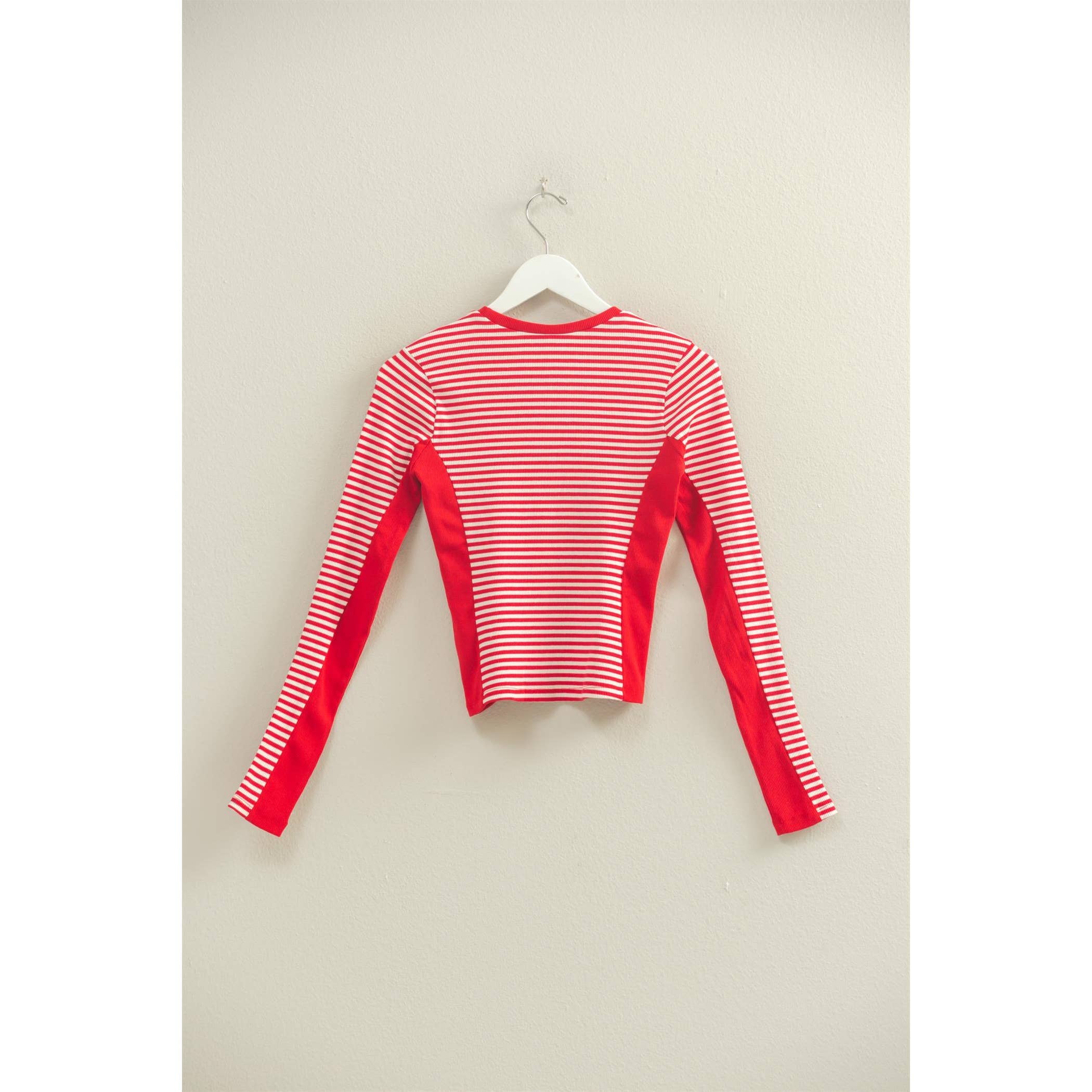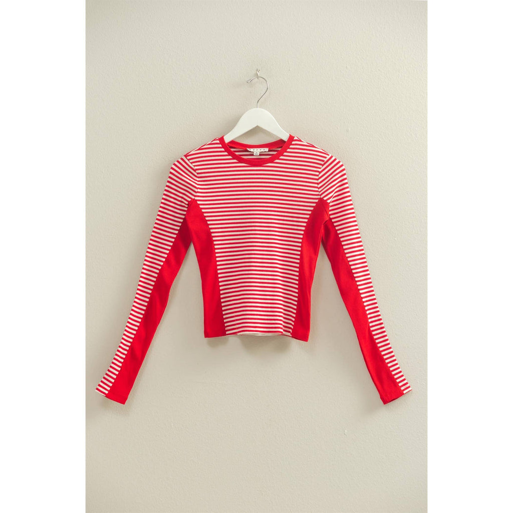 • Crafted with a blend of soft and stretchy fabrics, this long sleeve tee features eye-catching horizontal stripes and a unique contrast design