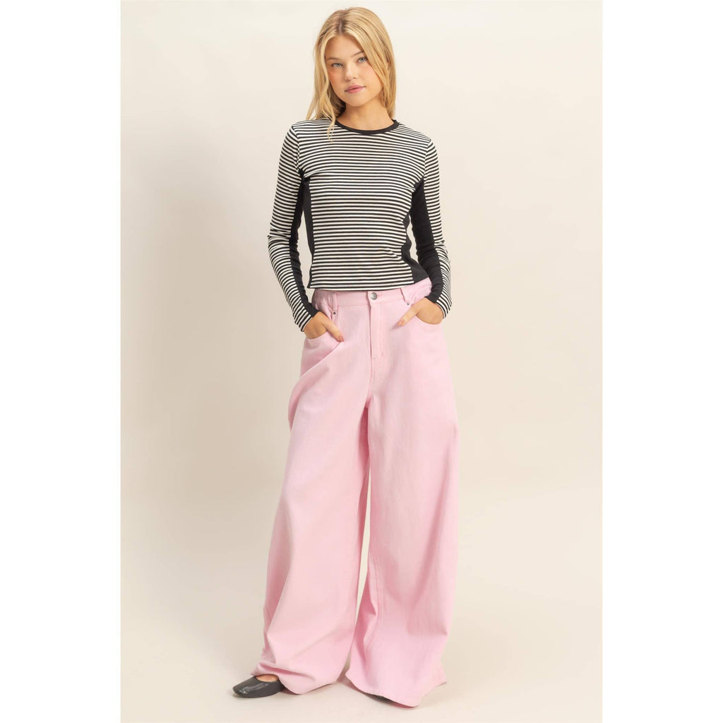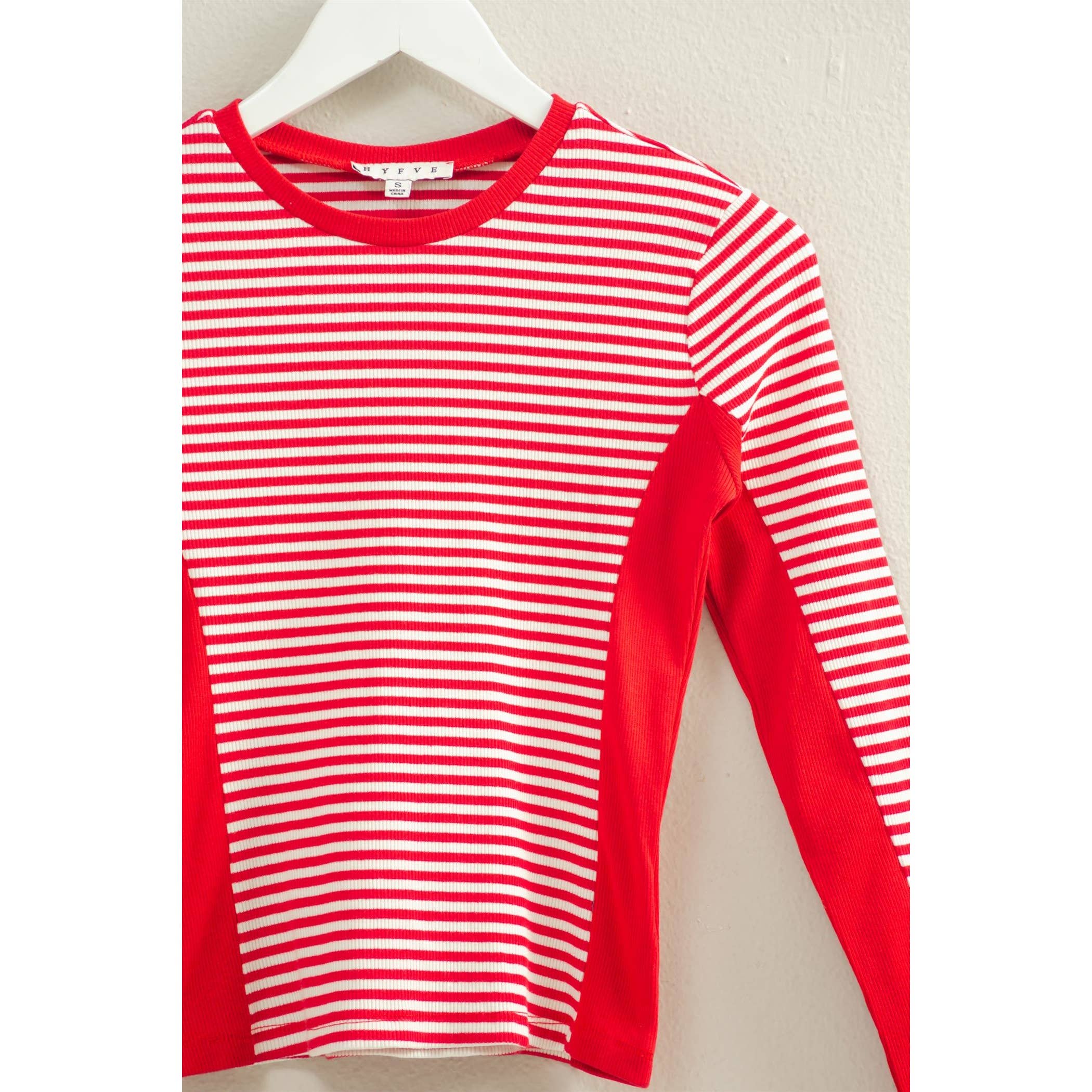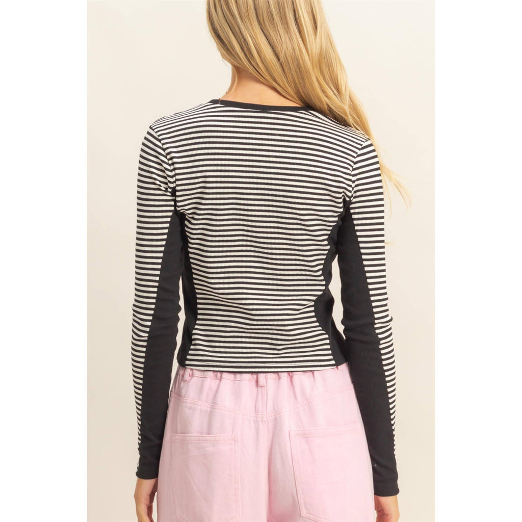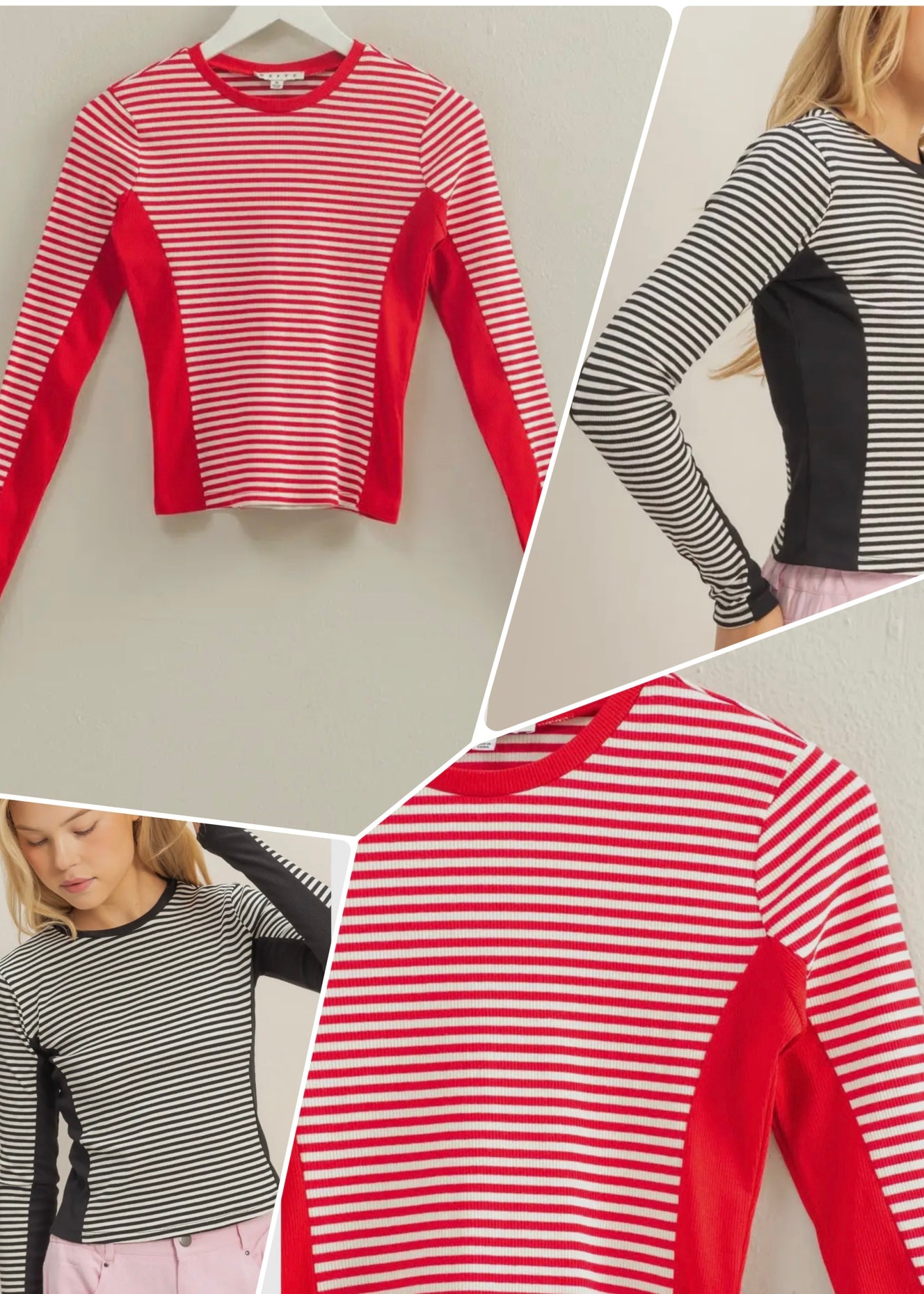 • Crafted with a blend of soft and stretchy fabrics, this long sleeve tee features eye-catching horizontal stripes and a unique contrast design