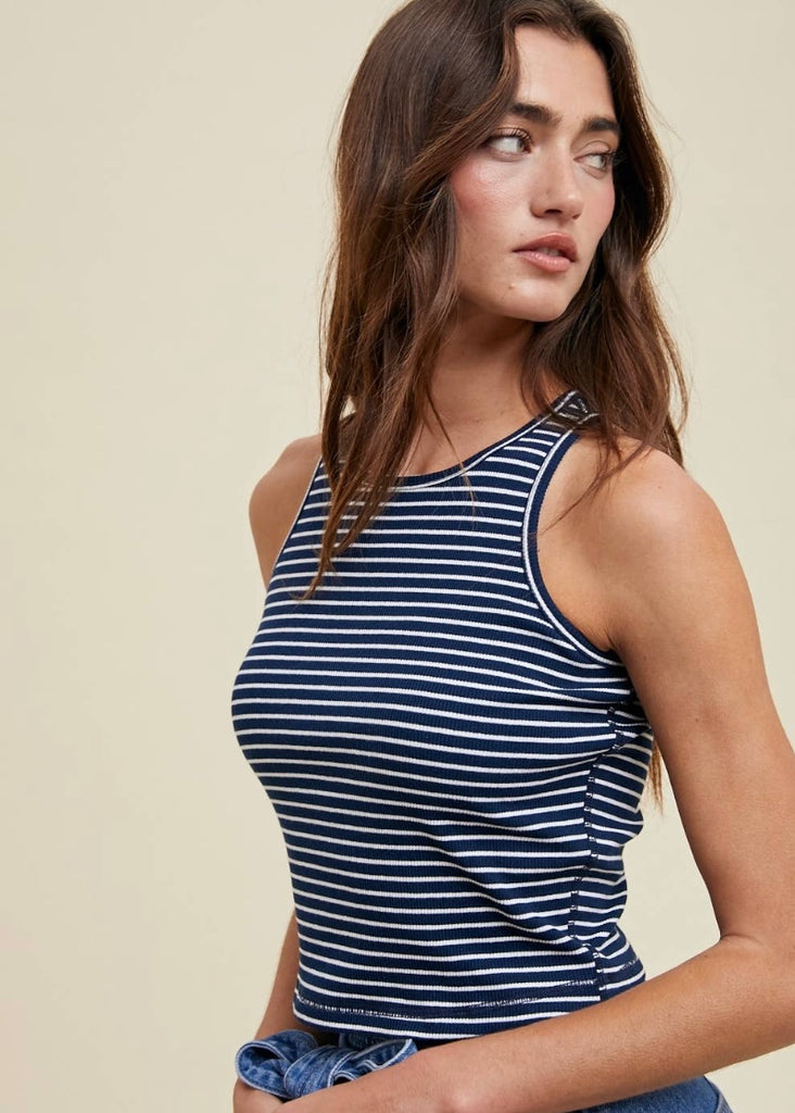 Elevate your casual look with the Evelyn Striped Tank Top. This sleeveless top features a round neck and a fitted silhouette, ensuring a comfortable and stylish fit. The removable padded bra adds versatility and convenience. Perfect for any occasion, this tank top offers a timeless and chic striped pattern.