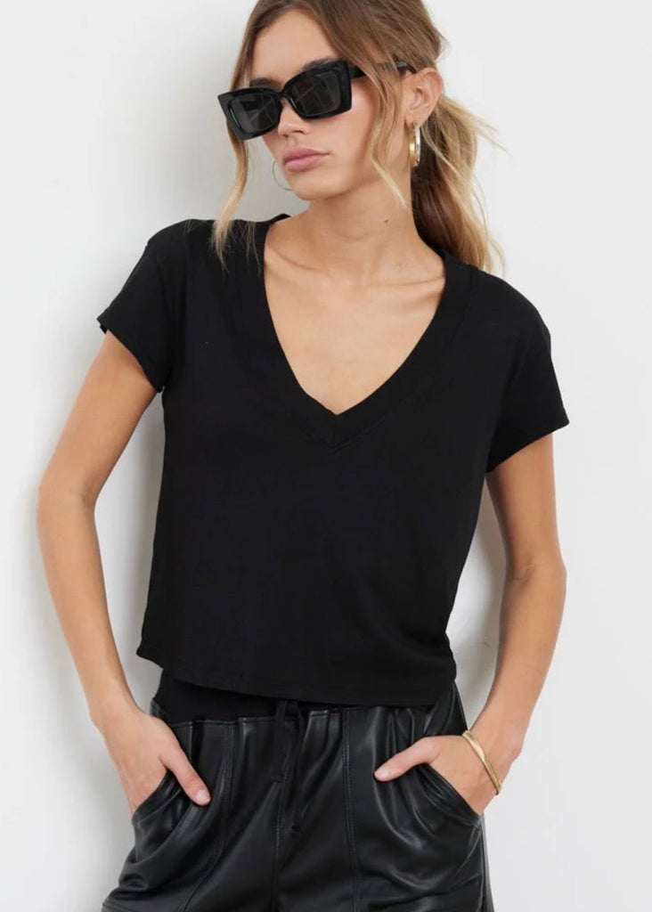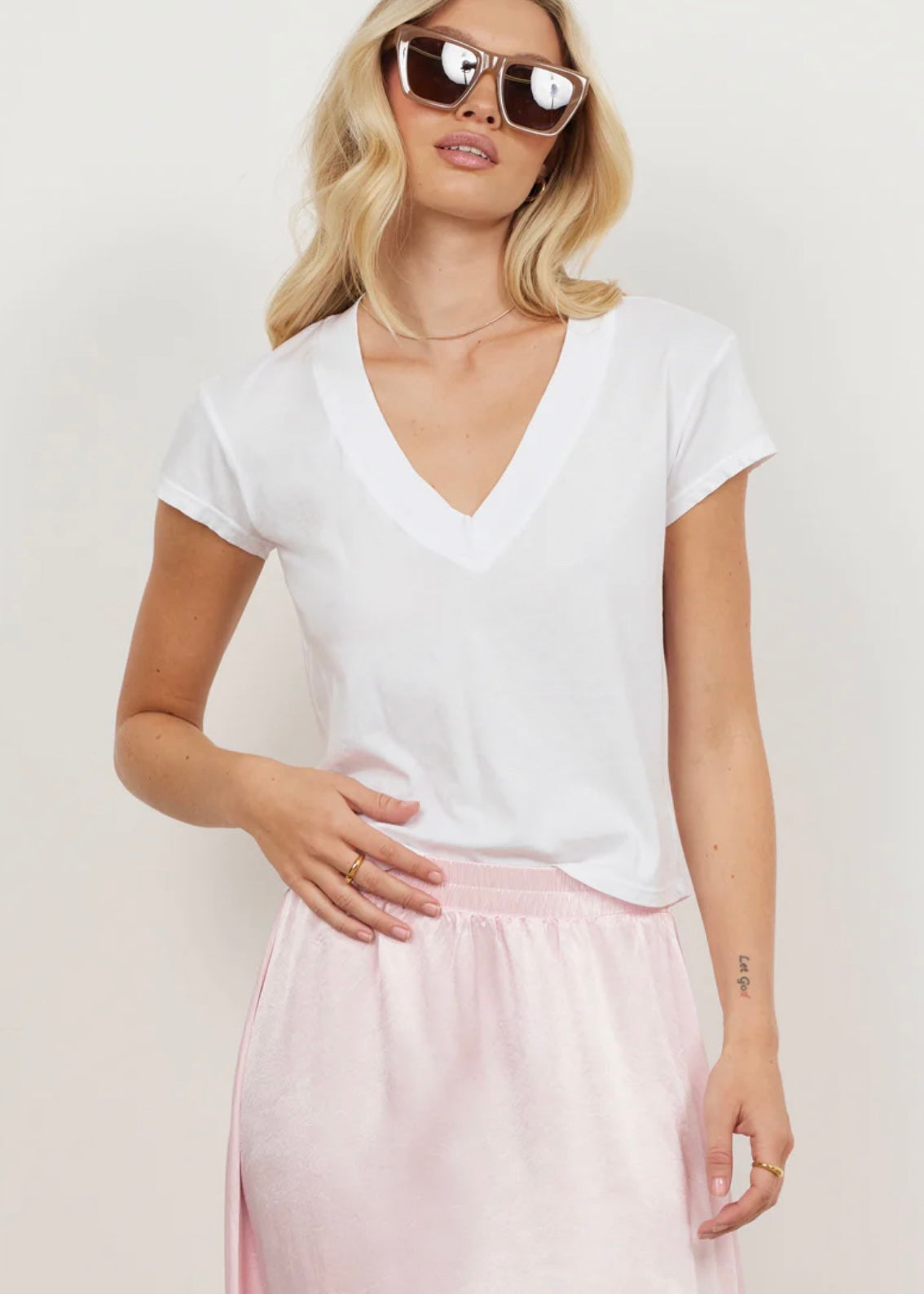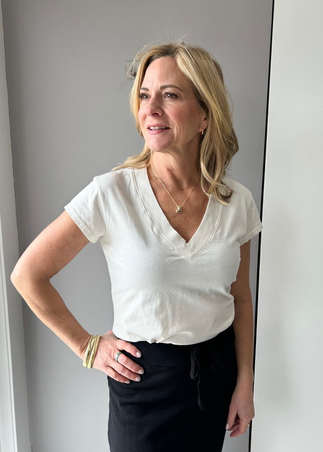 This deep V neck tee is anything but simple. It's crafted with a wide neckband, classic fit, and a meet and greet length. Pair it with jeans for a casual look, or dress it up with a blazer and heels. Made in our organic cotton, this fabric uses 91% less water than conventional cotton.