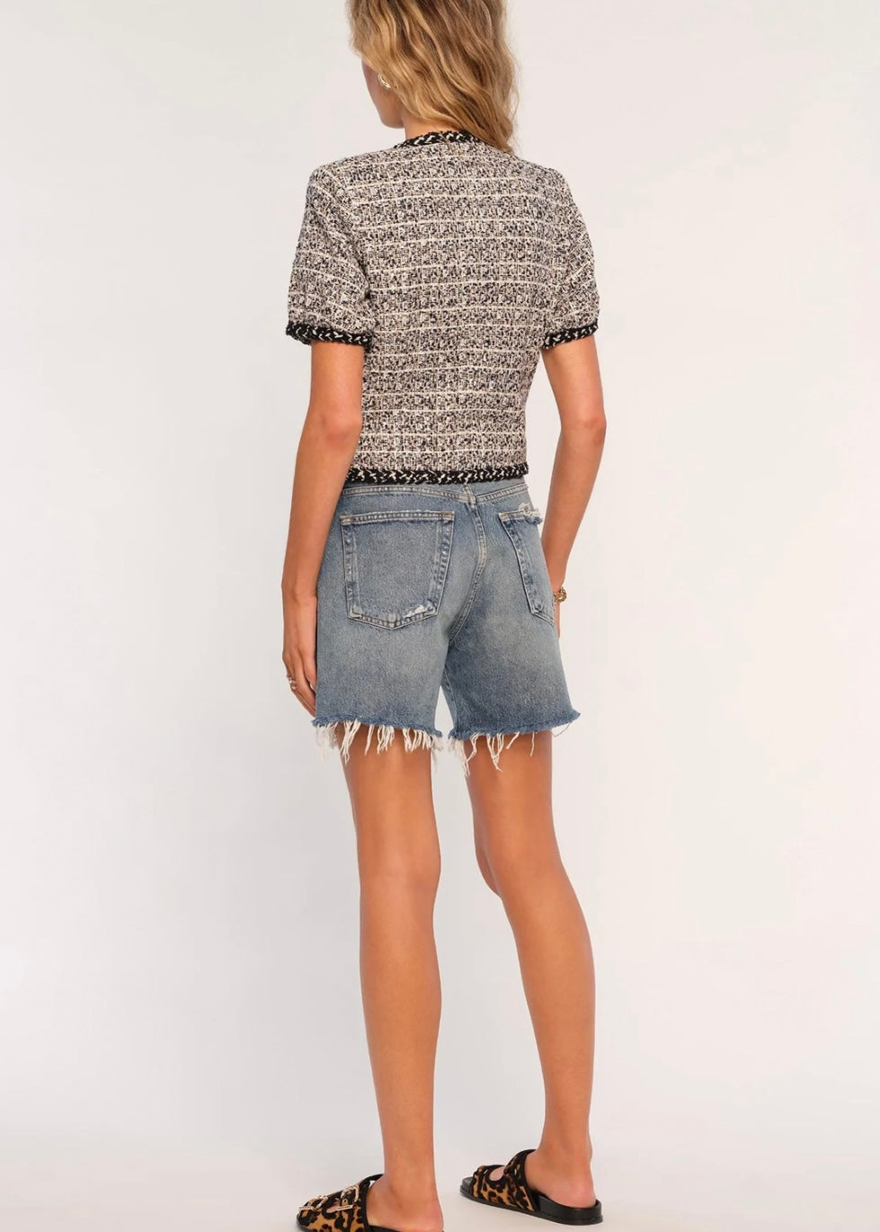 Meet our Susana Blazer the perfect day time blazer in a fun, textured tweed. It features novelty buttons, cute short sleeves and a slim fit. We love to pair it with straight leg jeans for a relaxed, casual look.