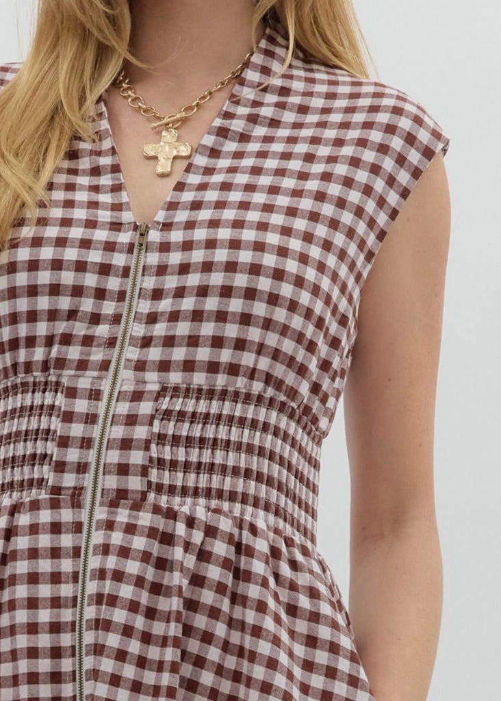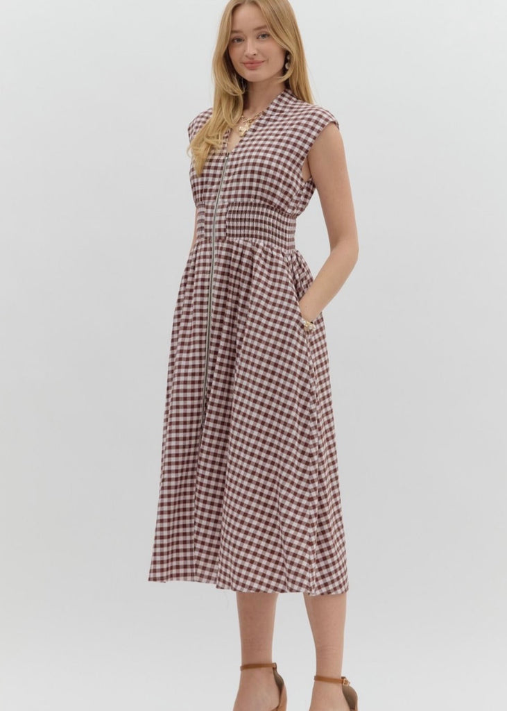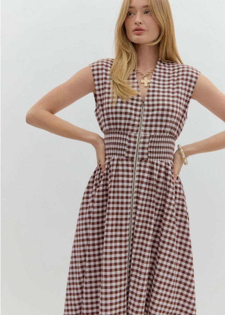 Gingham pattern V-neck sleeveless midi dress featuring zipper closure at front. Smocking at waist. Pocket at sides.