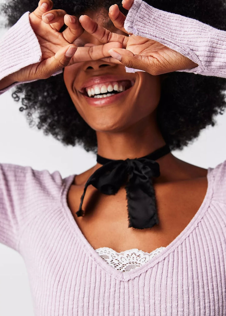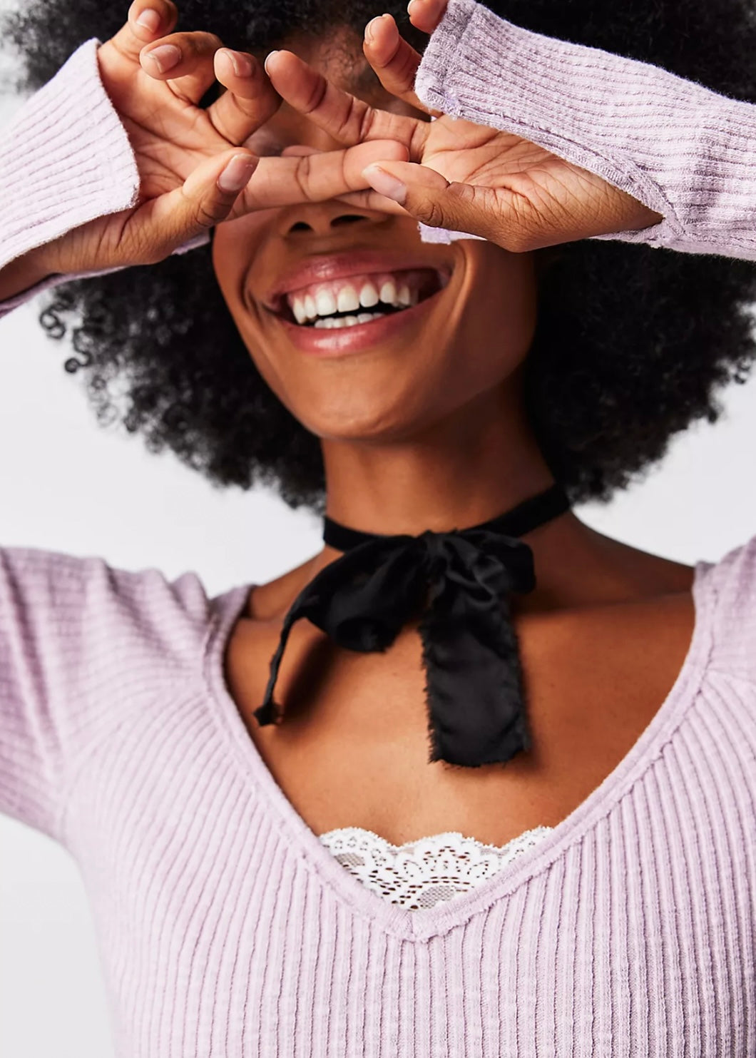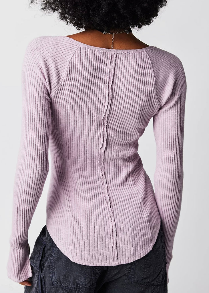 Just as effortless as it is essential, this lovely long sleeve tee is featured in a fitted, V-neck silhouette and ribbed knit fabrication with defined seaming, rounded bottom hem, and slits at the sleeve cuffs for added dimension.