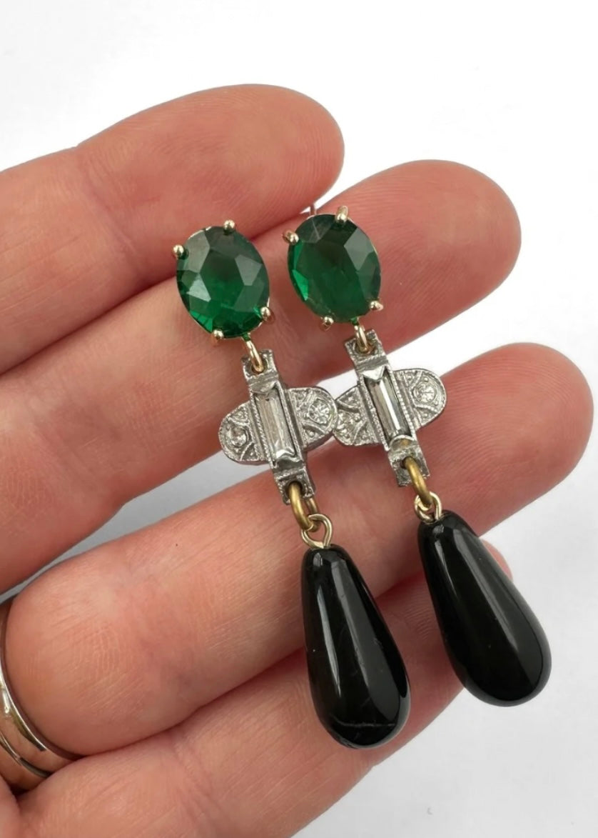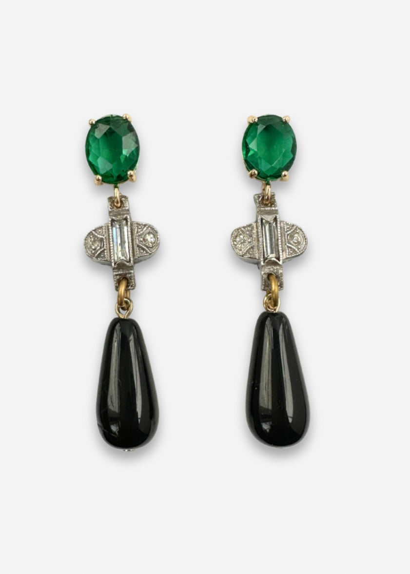 These earrings were made using a combination of both new and repurposed vintage materials. Small vintage silver and clear rhinestone links have been paired with black polished stone teardrop beads and kelly green oval crystal posts.